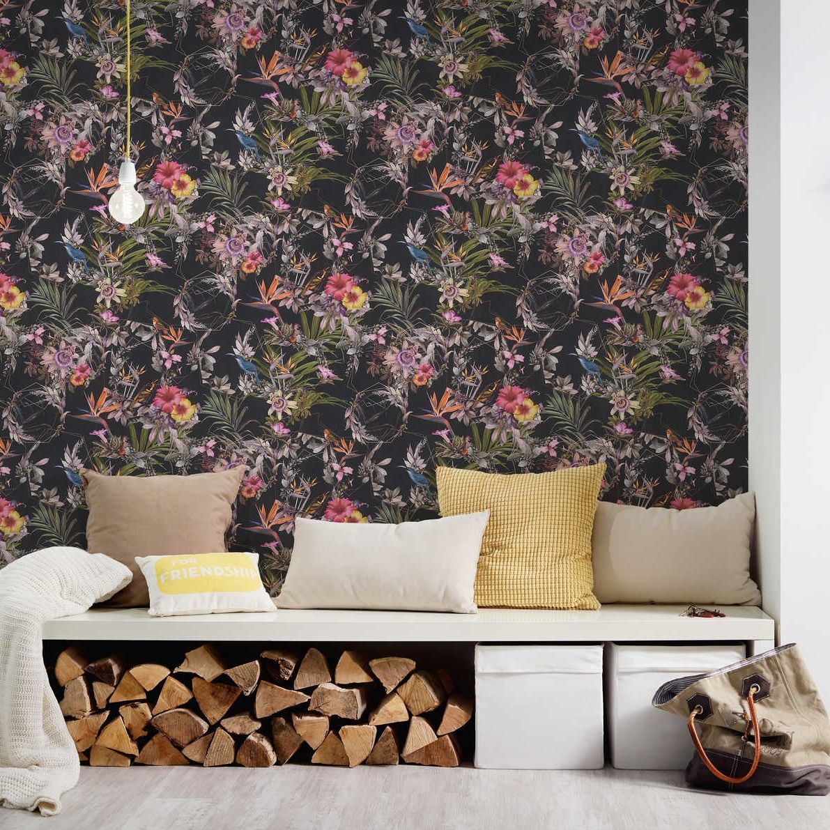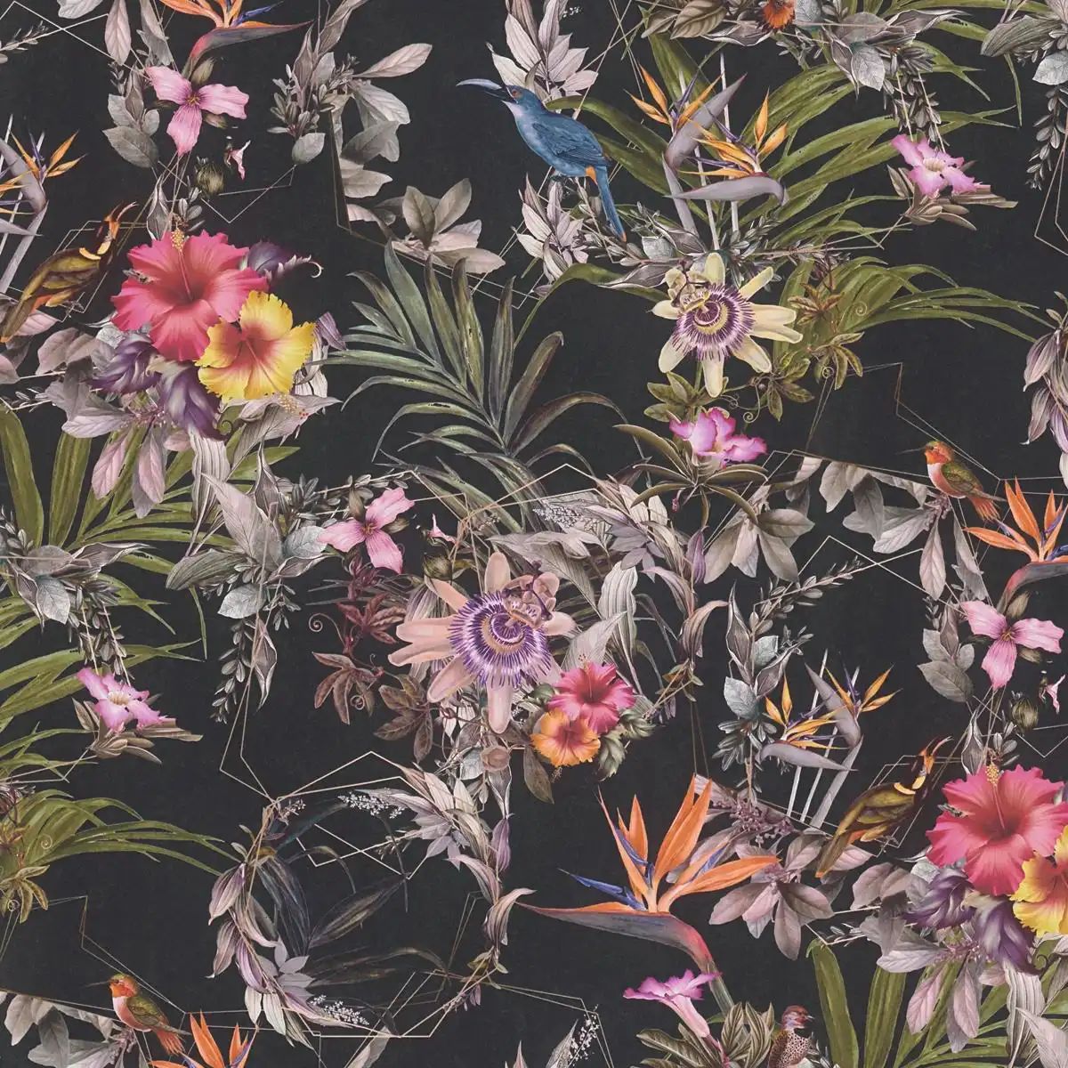 Wallpaper from A.S. Creation digital print collection that is on trend right now. Bold vibrant tones in a contemporary animal flora pattern. Perfect for a statement wall. Don’t miss out.