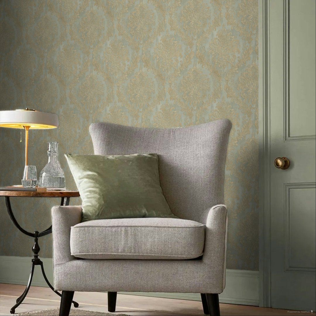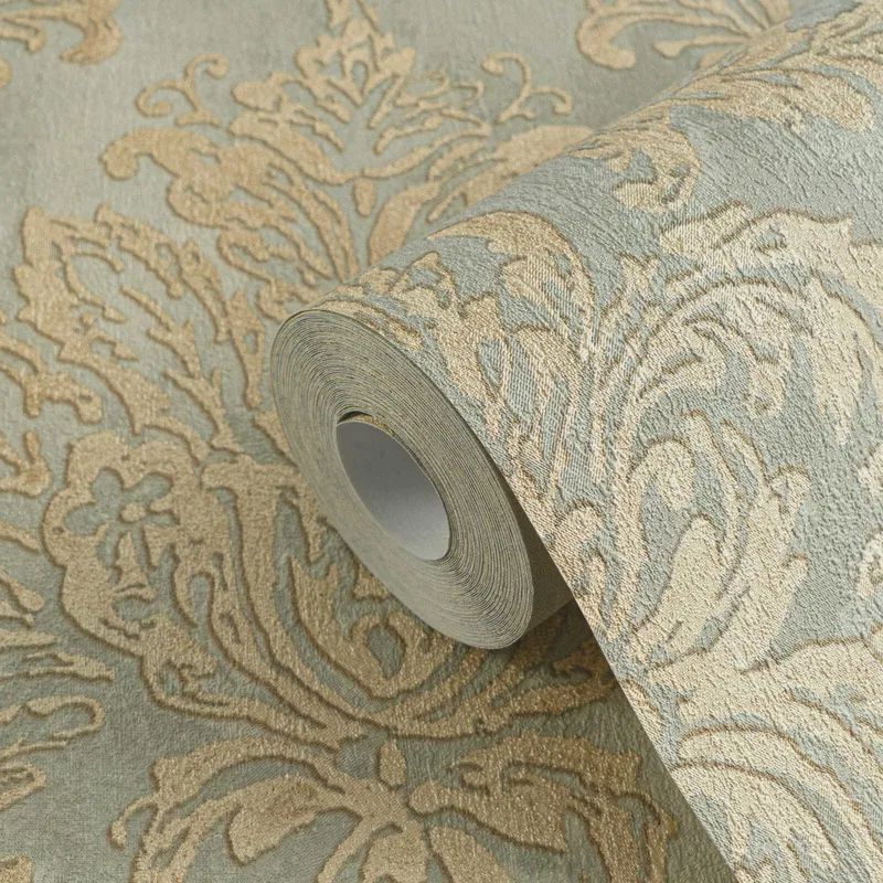 Grand Palace Duck Egg Green & Gold Damask Vinyl Wallpaper 79049-2