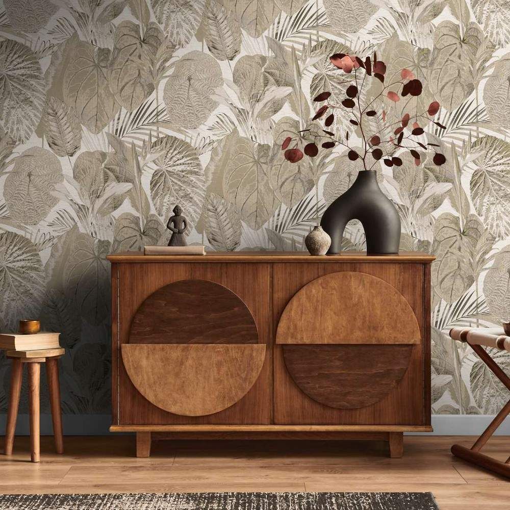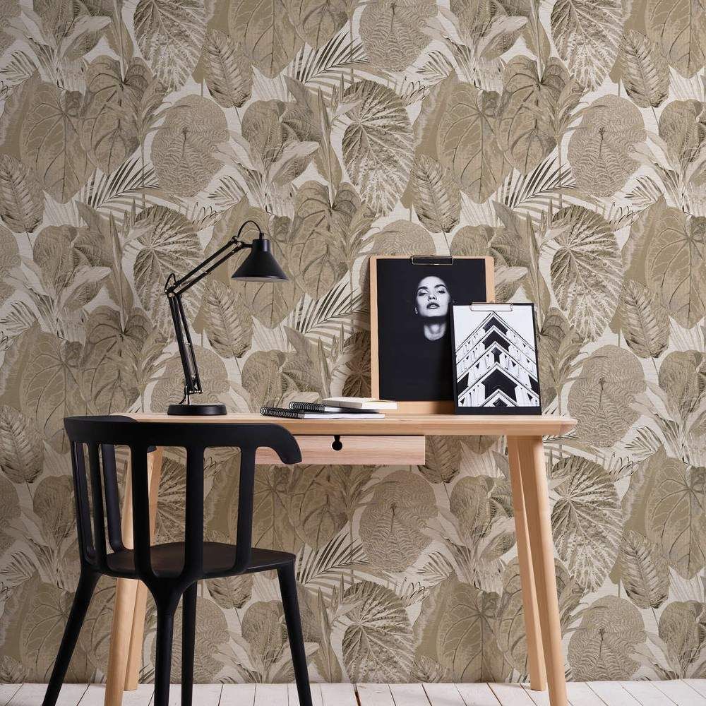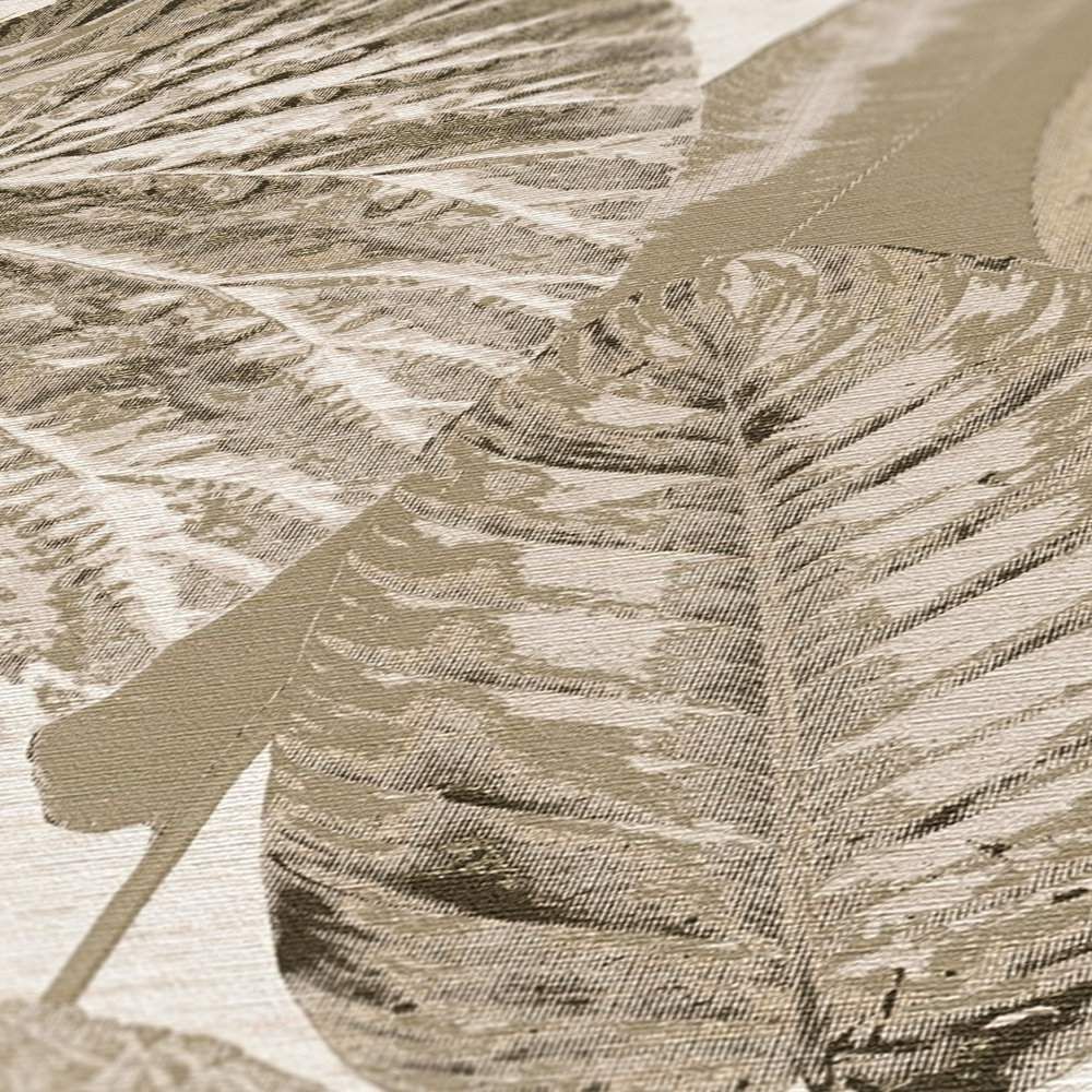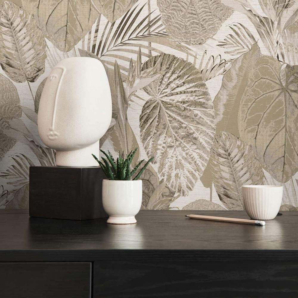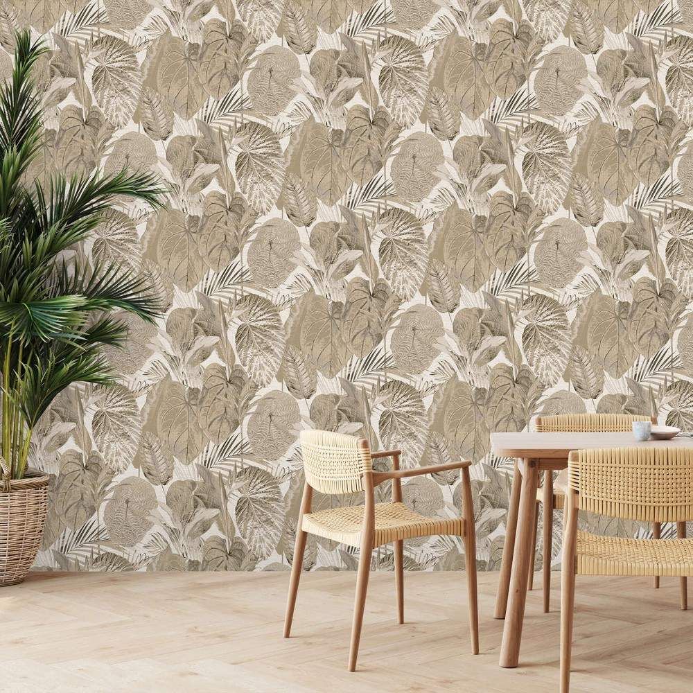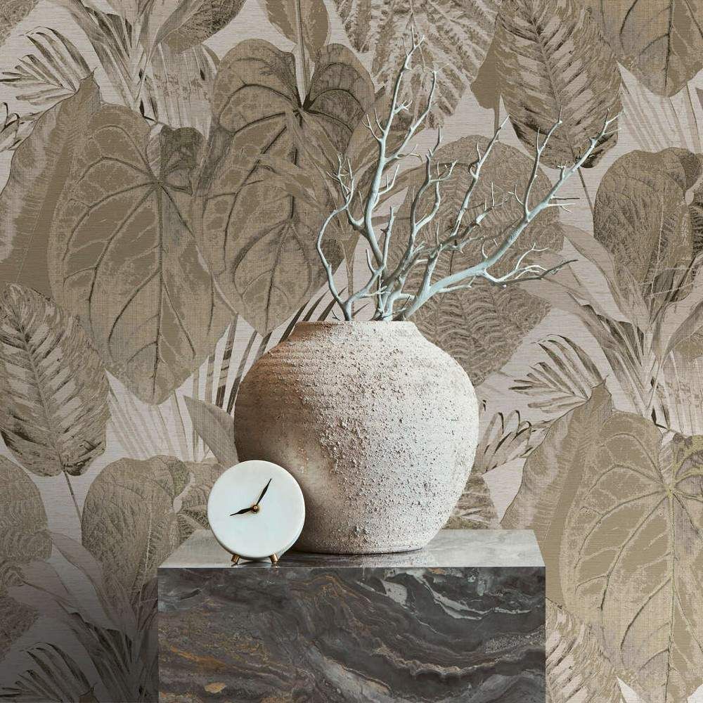 Jungle Silk Bold Leafy Floral Sand Beige Brown Vinyl Wallpaper 39355-1