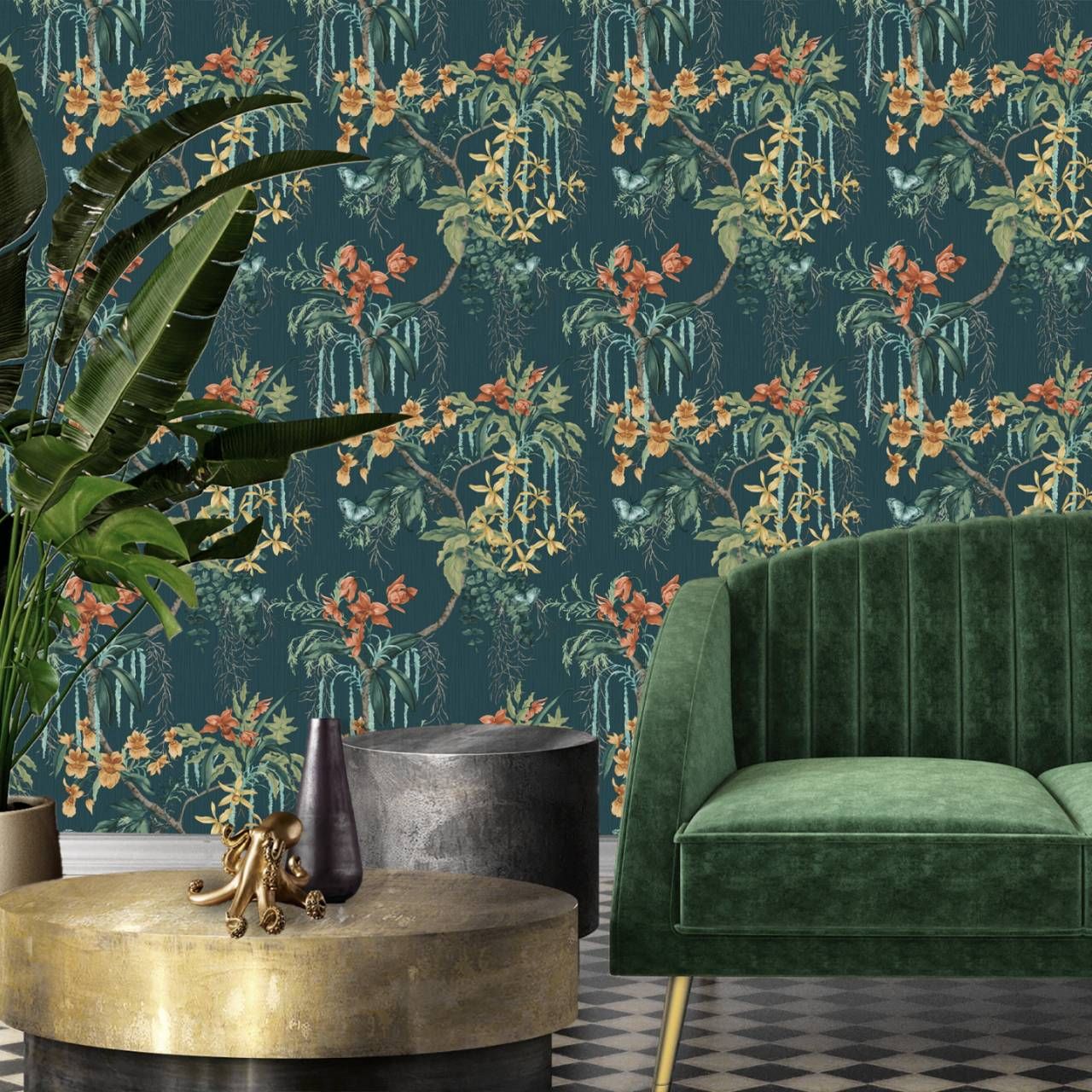 Suki Exotic Trailing Orchid Dark Green & Blue Wallpaper 2162