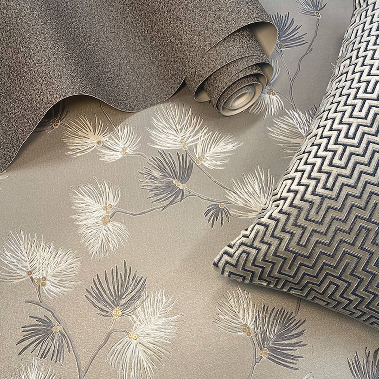 Calculate QuantityIntroducing a new and visually stunning addition to the luxury Italian wallcovering collection by Belgravia Décor – launching soon. Valentino Pine features a delicate, light-reflective pine leaf trail, with a subtle sequin detail at the centre of each leaf, beautifully complementing Belgravia’s much-loved Valentino sequin texture. Each elegant trail is set against a rich satin backdrop, adding depth and sophistication to your walls. Showcased here in the opulent Mocha colourway (1934) – a perfect blend of natural elegance and modern glamour.
