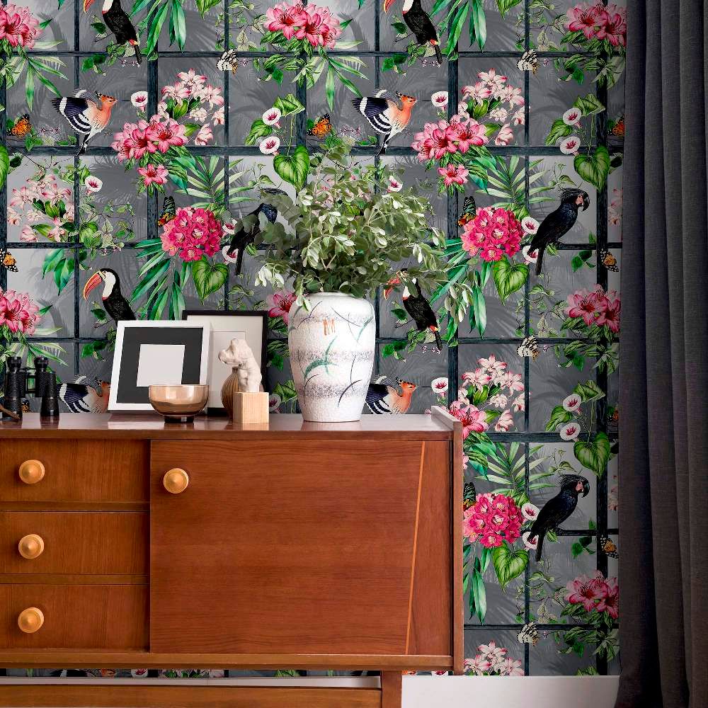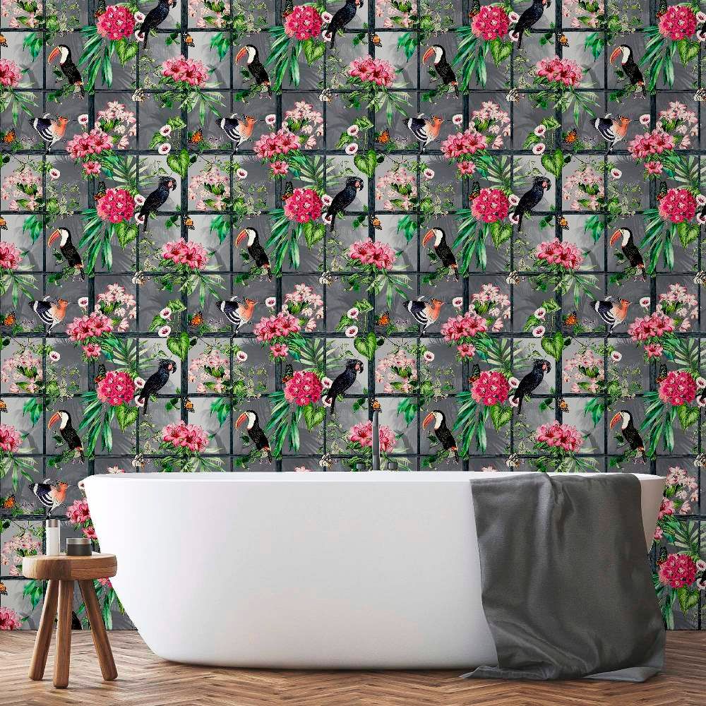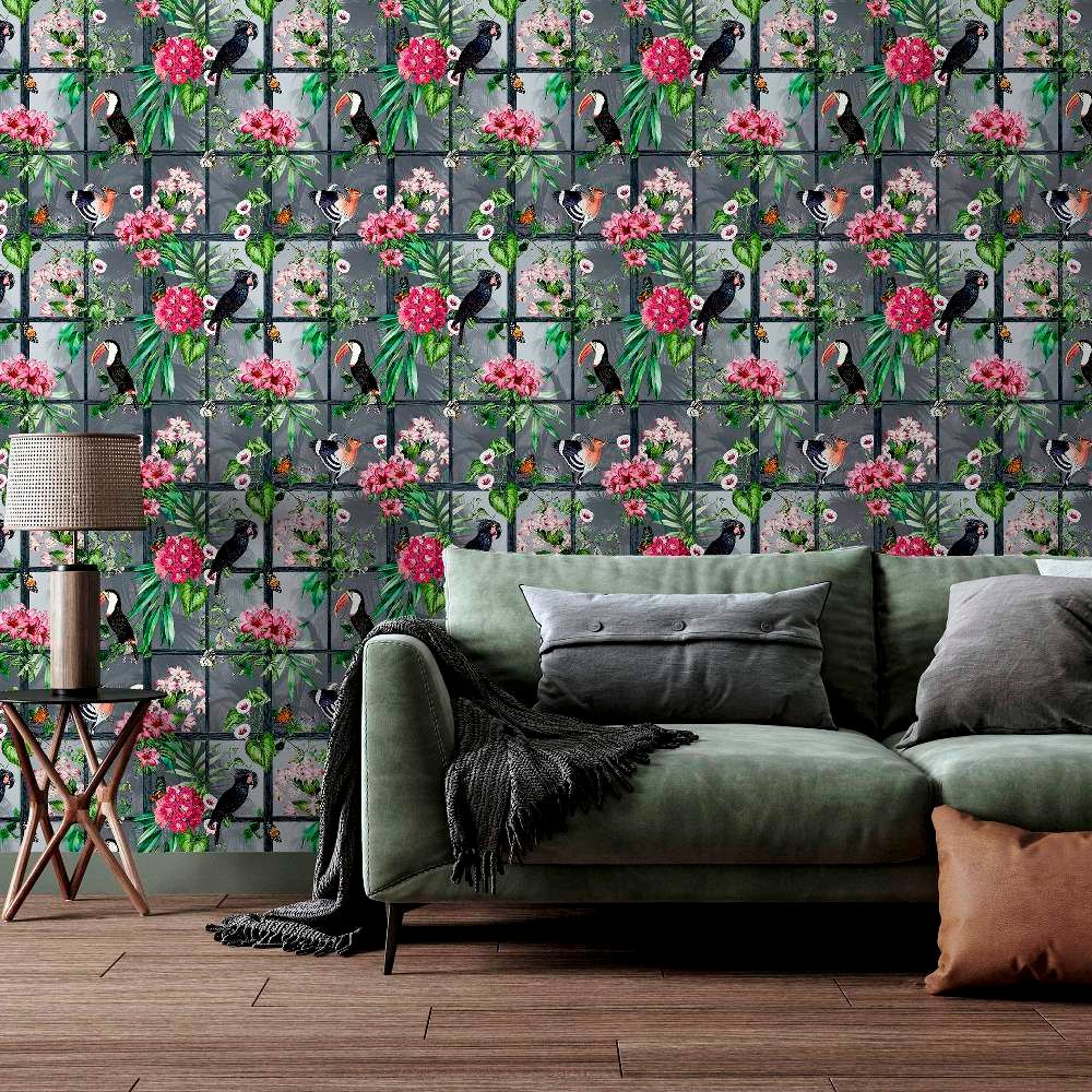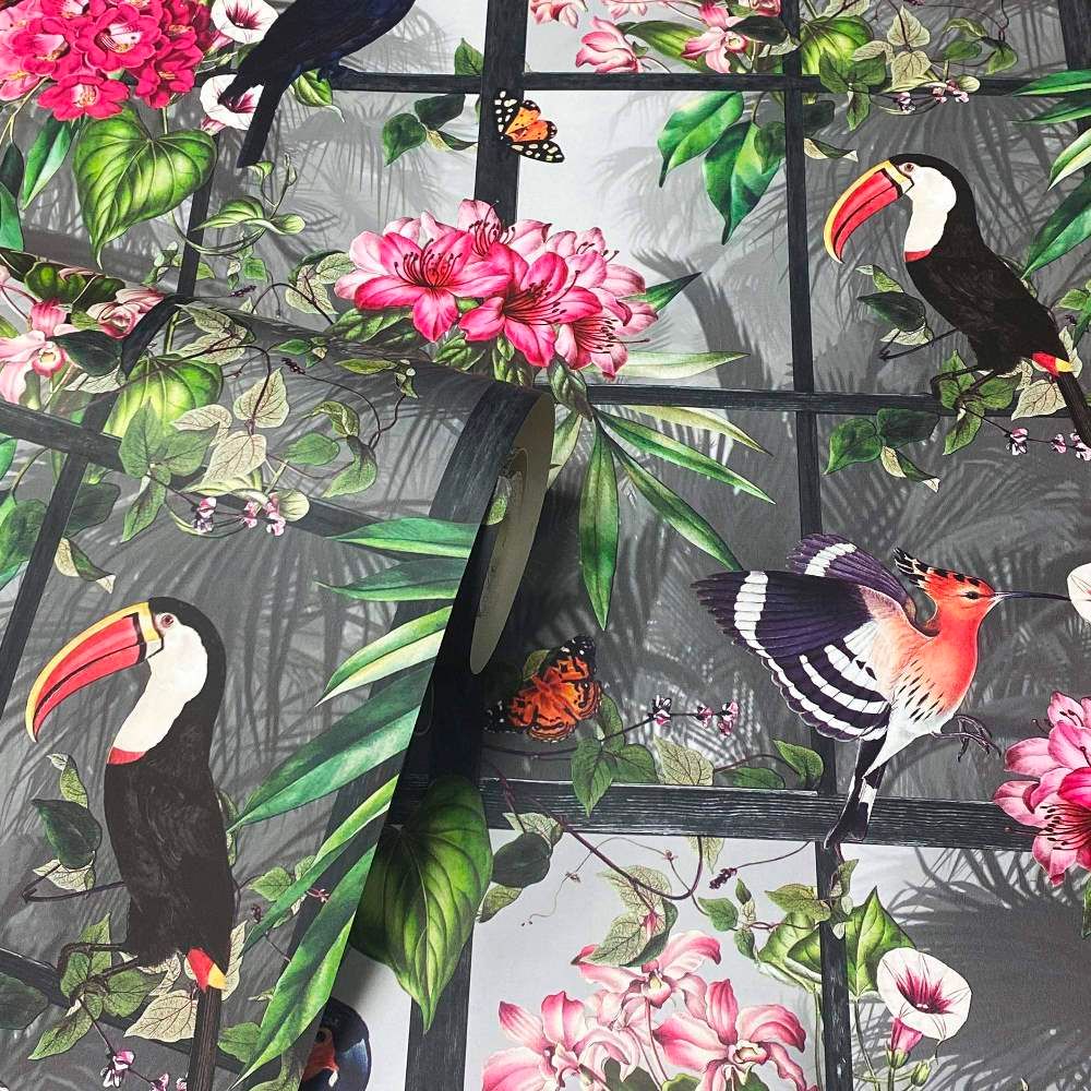 Calculate QuantityExperience a burst of artistic brilliance with the Cuban Tropicana, a mesmerizing display of creativity. This wallpaper showcases an array of vibrant Toucans, Parrots, Hummingbirds, and butterflies amidst a lush tropical landscape, adorned with shades of pink and green. The entire composition is set against a captivating, dark, and whimsical window-style backdrop, which imparts a captivating depth to the overall design.