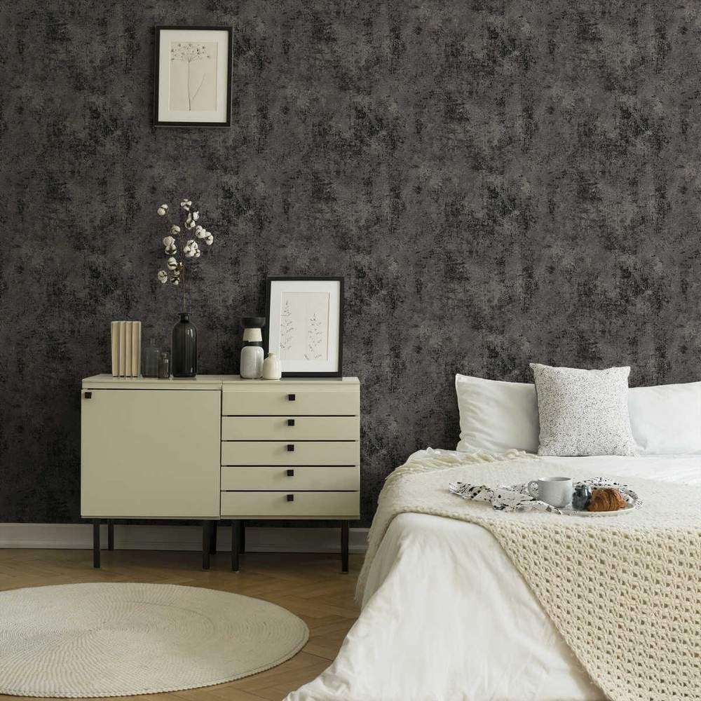 A straightforward faux plaster design with a distressed effect, featuring multi-tonal and textured elements to add depth to any space. It creates an aged look with a modern twist. Displayed here in the Carbon colorway.