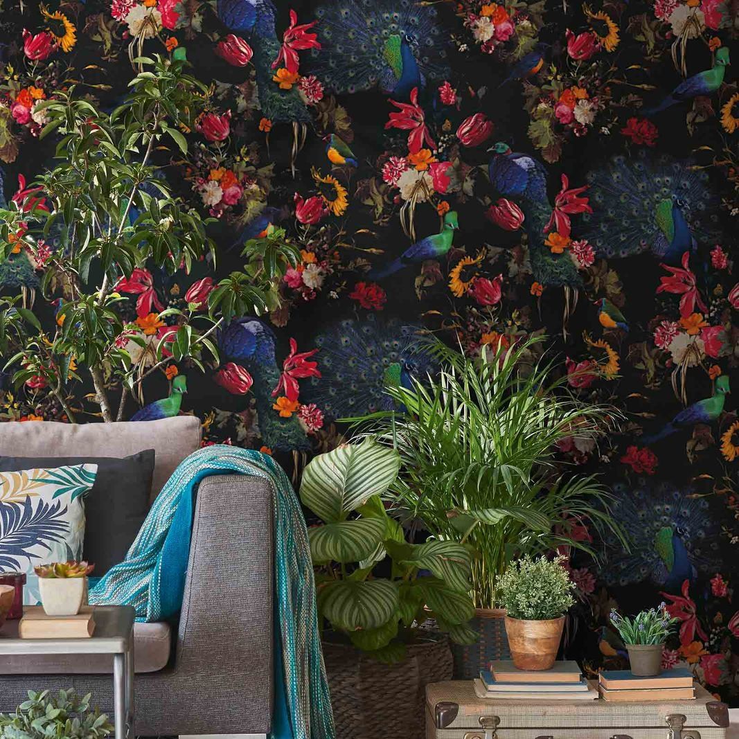 Bold, bright and quirky wallpaper featuring peacock birds. Please purchase a sample for true colour and texture. This superb Tropical birds wallpaper from Erismann is ideal for a feature wall, paired with another paper, or running throughout a room.