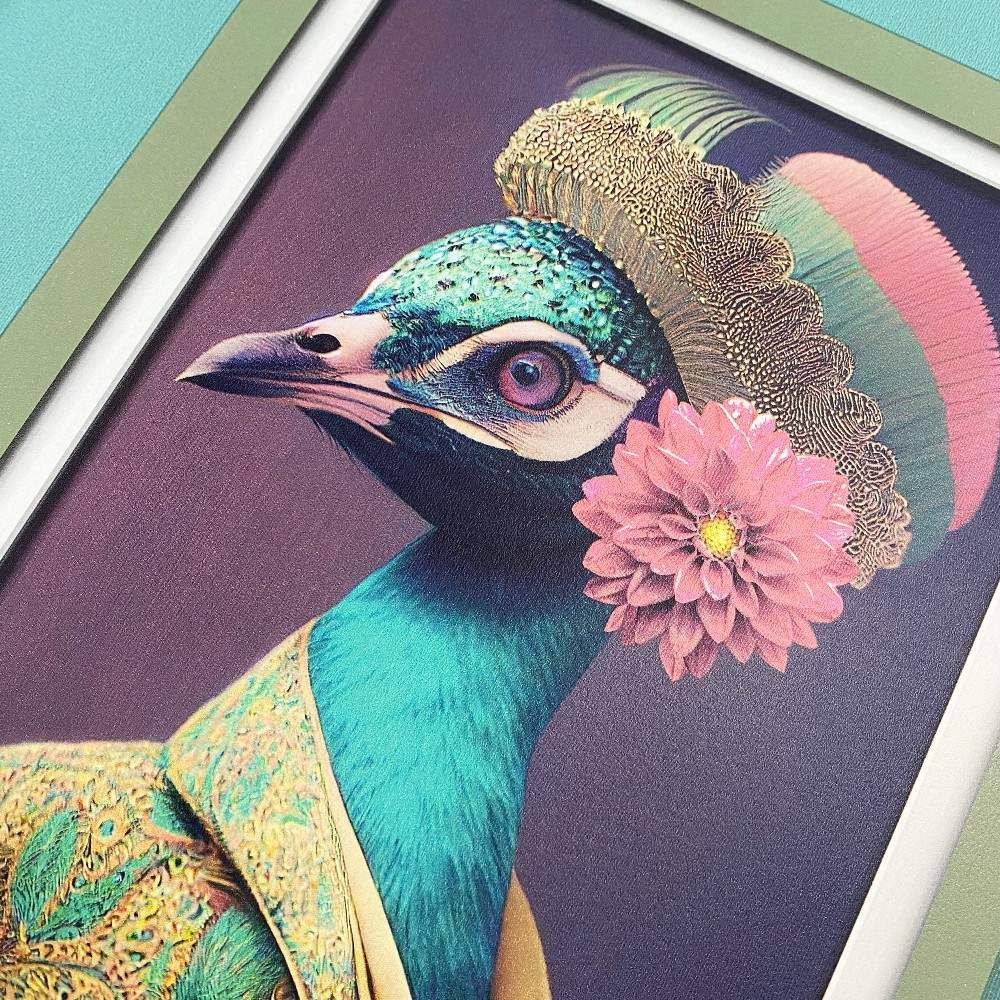An colourful and light-hearted gallery wall featuring framed animals. This vibrantly coloured design showcases a fashionable peacock and a cute koala. A wonderful feature wall that is sure to make people happy.