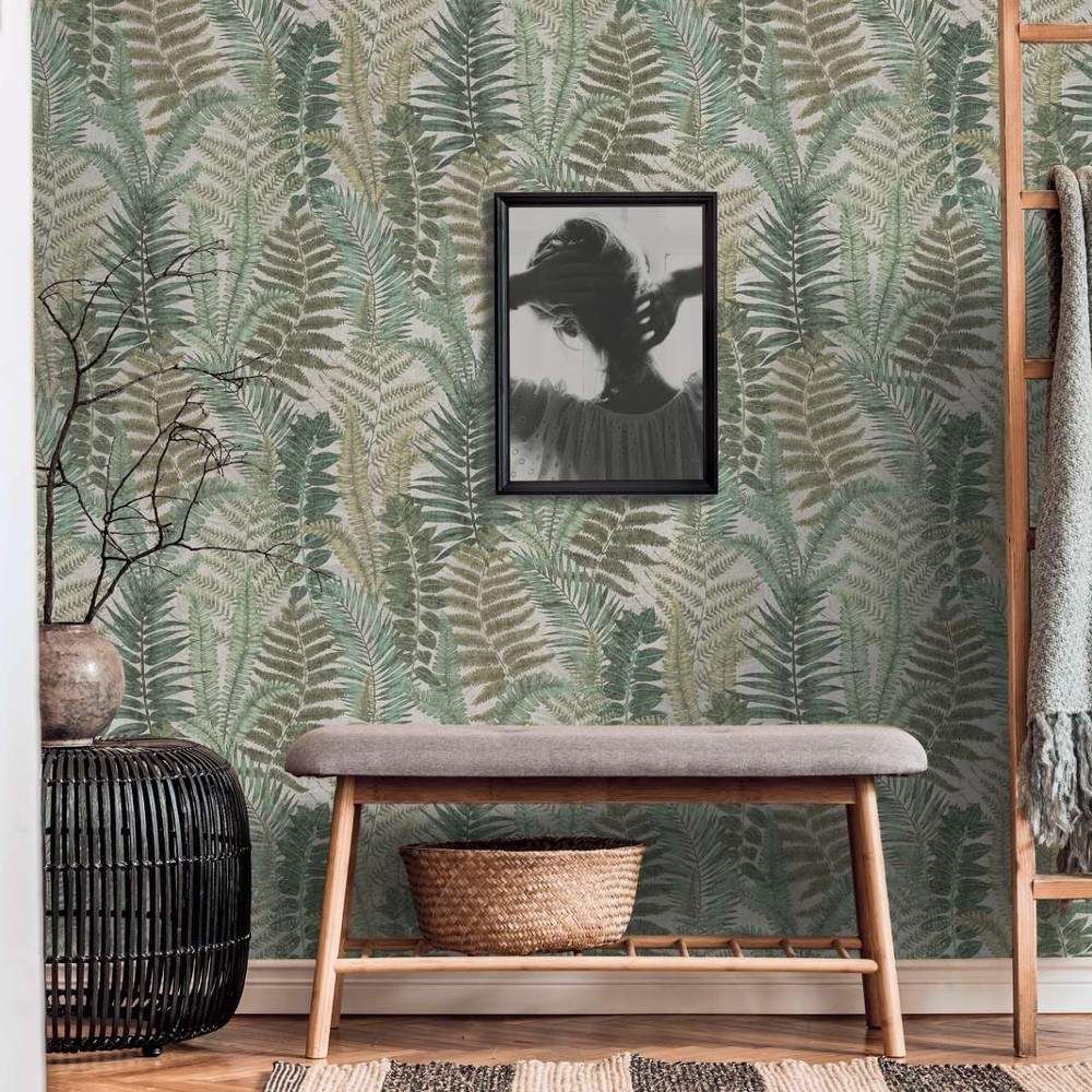 Fern Leaves Fabulous Beige Green Floral Textured Vinyl Wallpaper 39347-4