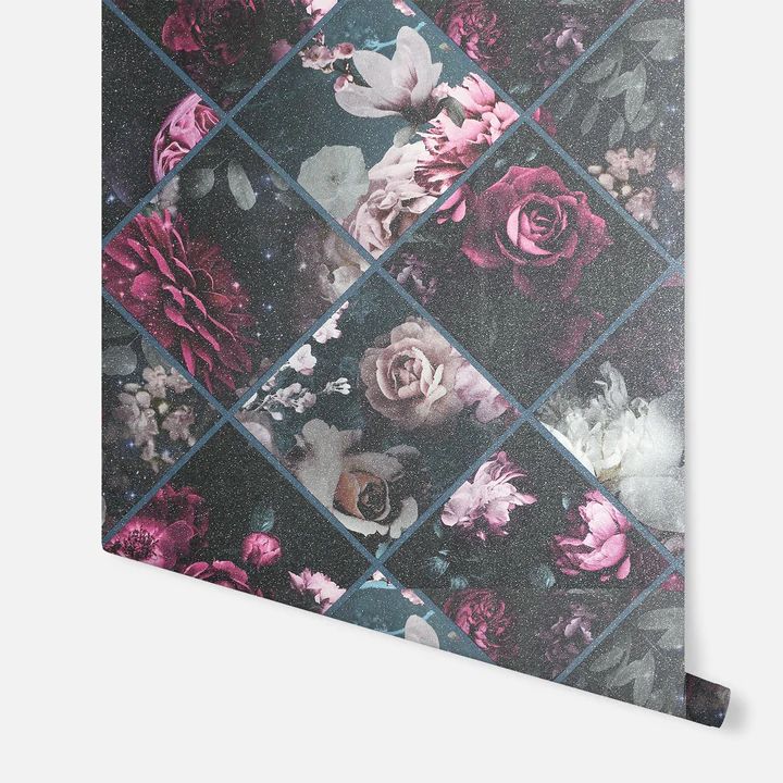 Calculate QuantityDark and dramatic, this photographic style wallpaper depicts floral motifs, in contemporary plum and petrol blue tones on a dark black background. This wallpaper will add drama to any room thanks to its striking collage design style and soft glitter finish. This paper is the perfect choice for a feature wall or chimney breast in a bedroom - paired with painted walls to draw the eye to its design. You could also hang it in a cloakroom or living space to get the look you want. Suitable for most rooms except high moisture environments, like bathrooms.