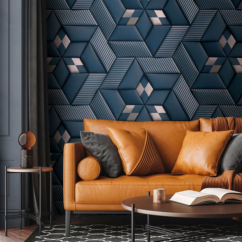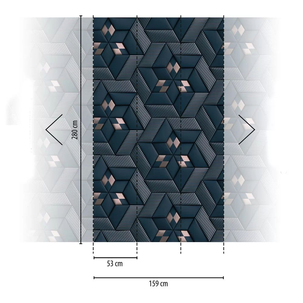 Calculate QuantityThis wallpaper features a striking and modern geometric design with a three-dimensional effect. The four-sided shapes form an intricate star pattern, accented with metallic rose gold highlights for added depth and elegance. It is provided in three 2.8-meter lengths on a 53cm wide roll, with a mural that creates a continuous, side-to-side repeating image.