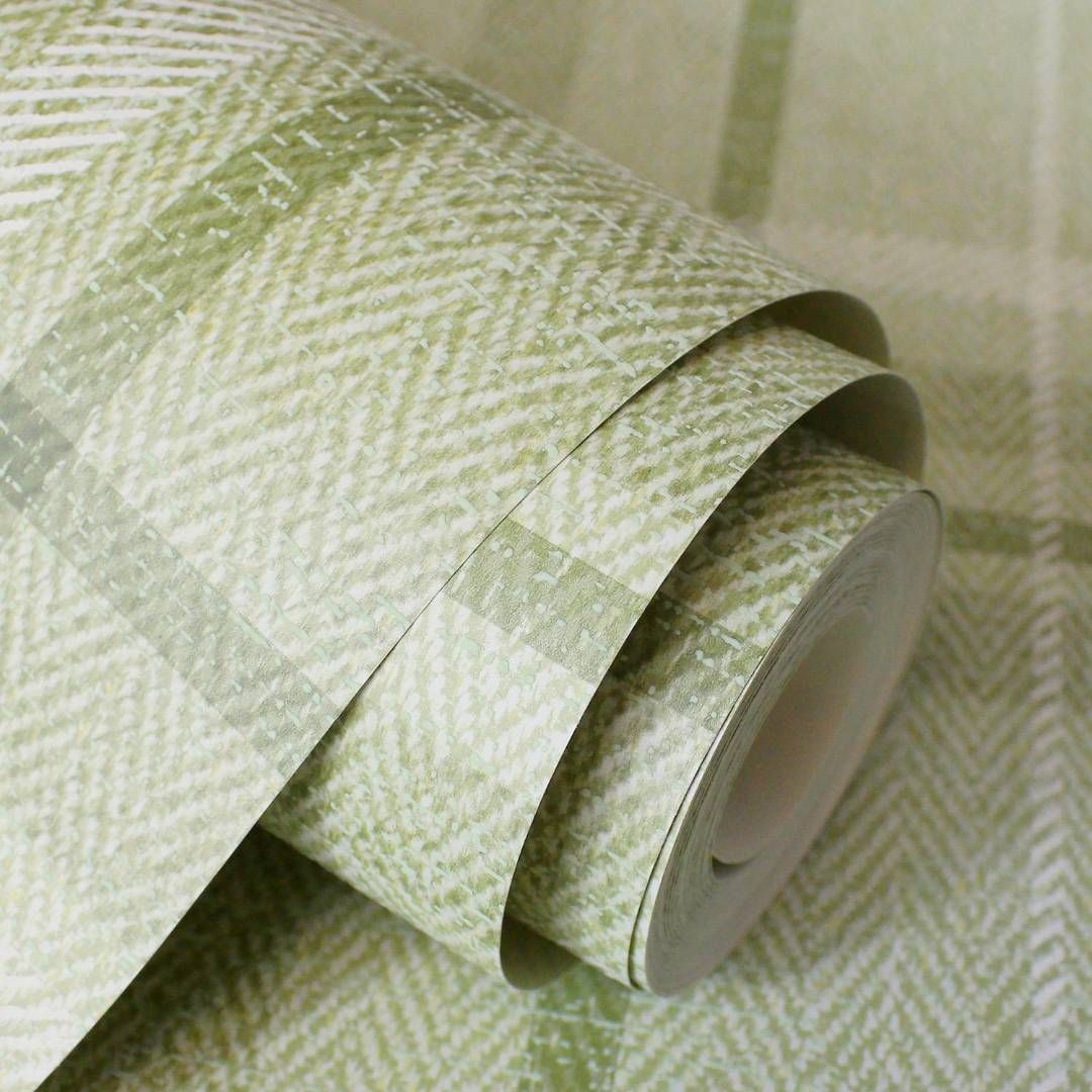 Harris Check Sage Green Tweed Herringbone Wallpaper by Crown M1865