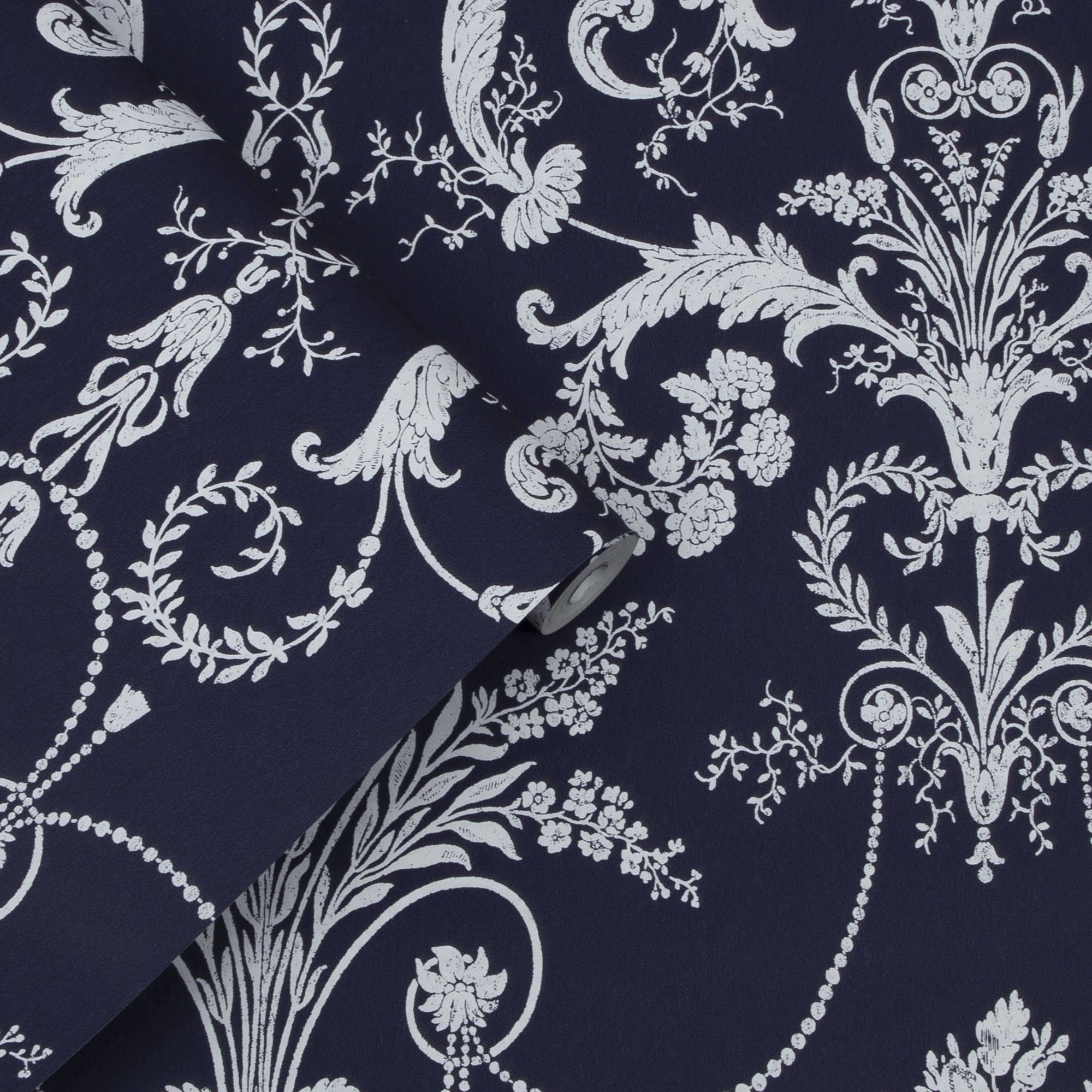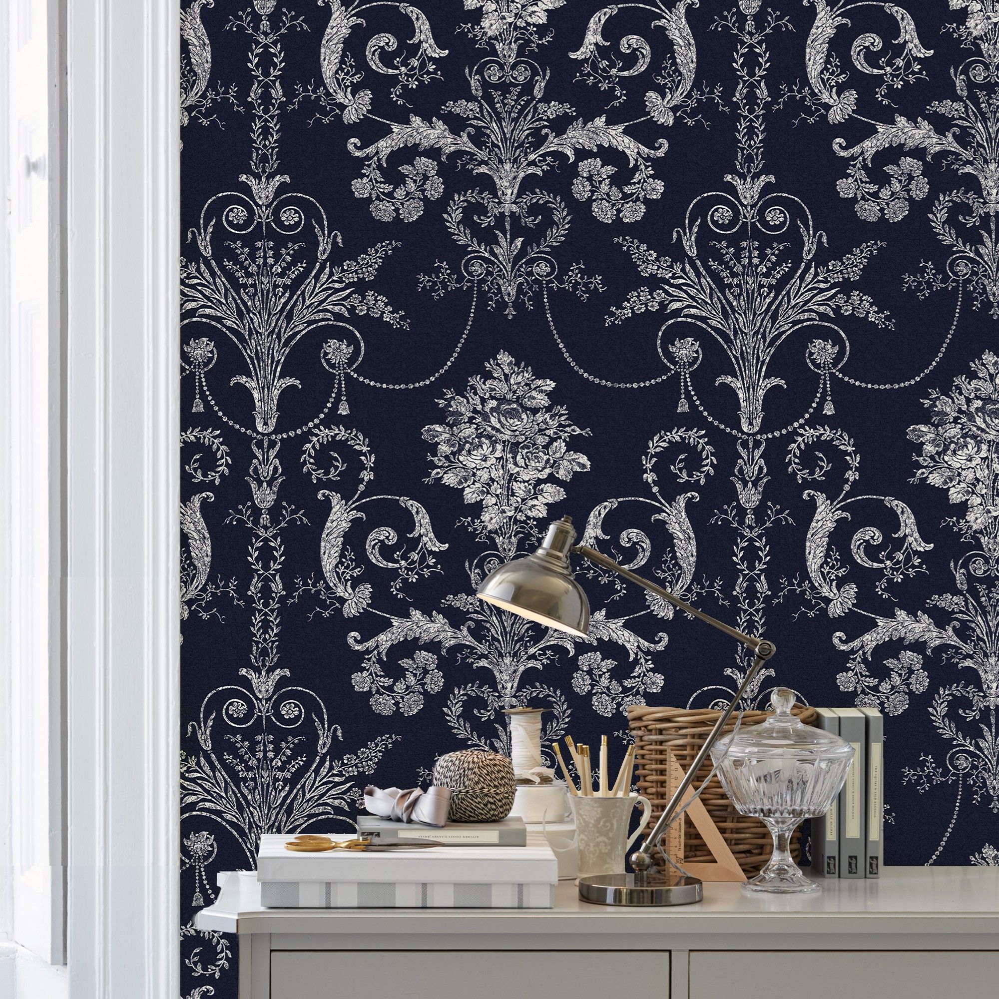 Josette French Toil Damask Midnight Navy Laura Ashley Wallpaper 113386