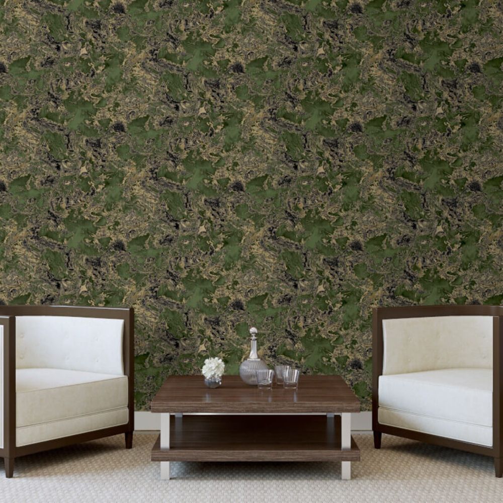 Liquid Swirl Marble Green & Metallic Gold Wallpaper 6358