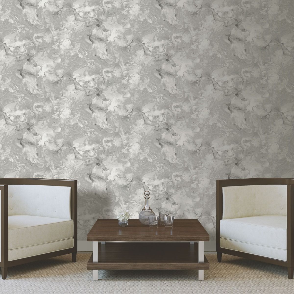 Liquid Swirl Marble Grey & Metallic Silver Wallpaper 6355
