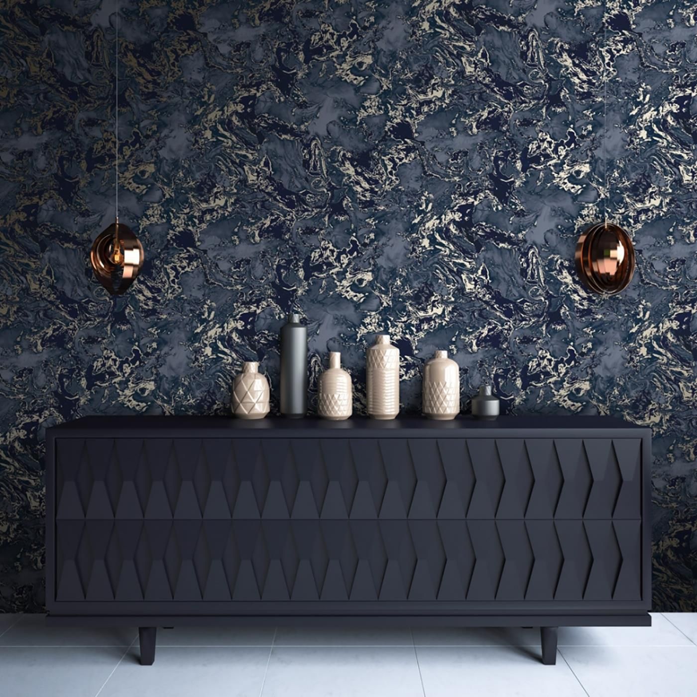 Liquid Swirl Marble Navy & Silver/Metallic Champagne Wallpaper 6365