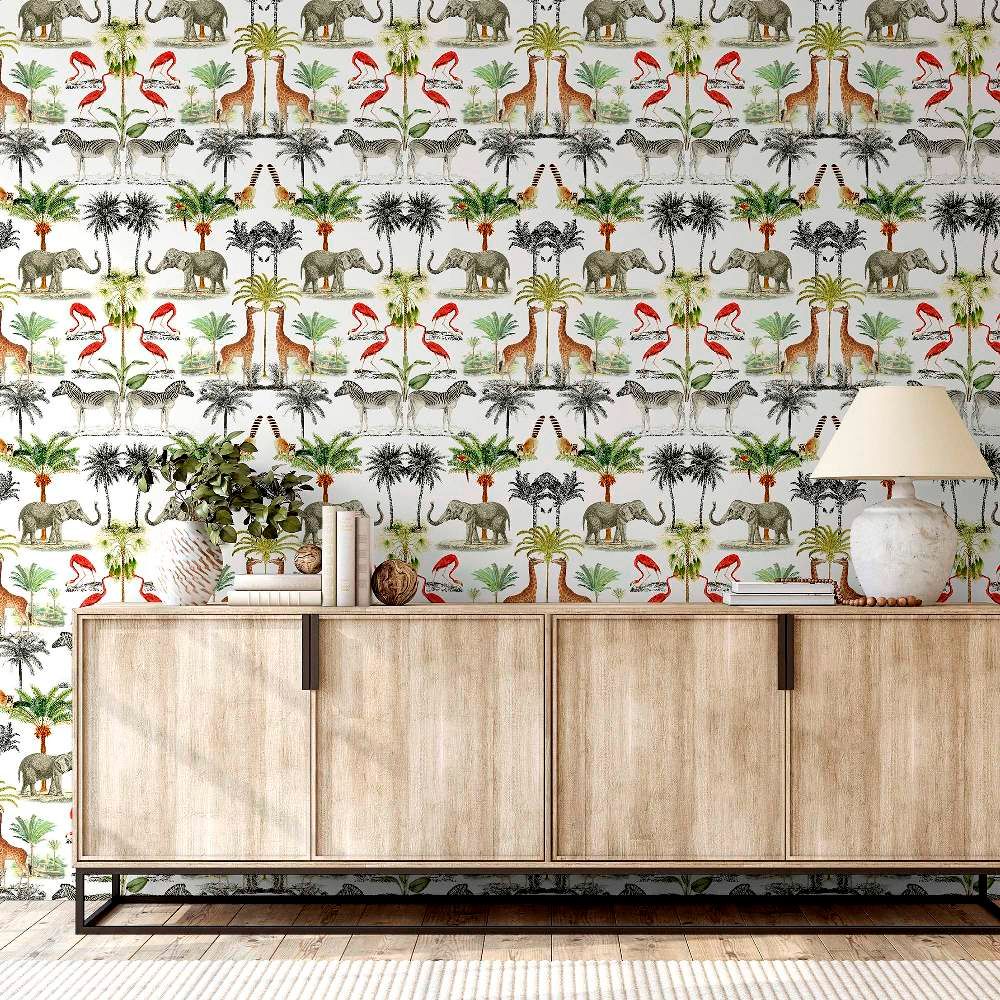 Calculate QuantityEmbark on a safari adventure with our captivating Animal-themed wallpaper. This enchanting design showcases a vibrant array of elephants, zebras, giraffes, flamingos, and lemurs set against a pristine white backdrop. These lively creatures are artfully mirrored by an assortment of palm trees, presented in both vivid colours and classic black and white. This exotic print promises to infuse your space with an instant dose of whimsical charm and personality.