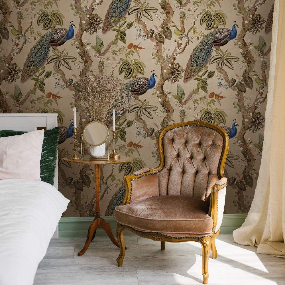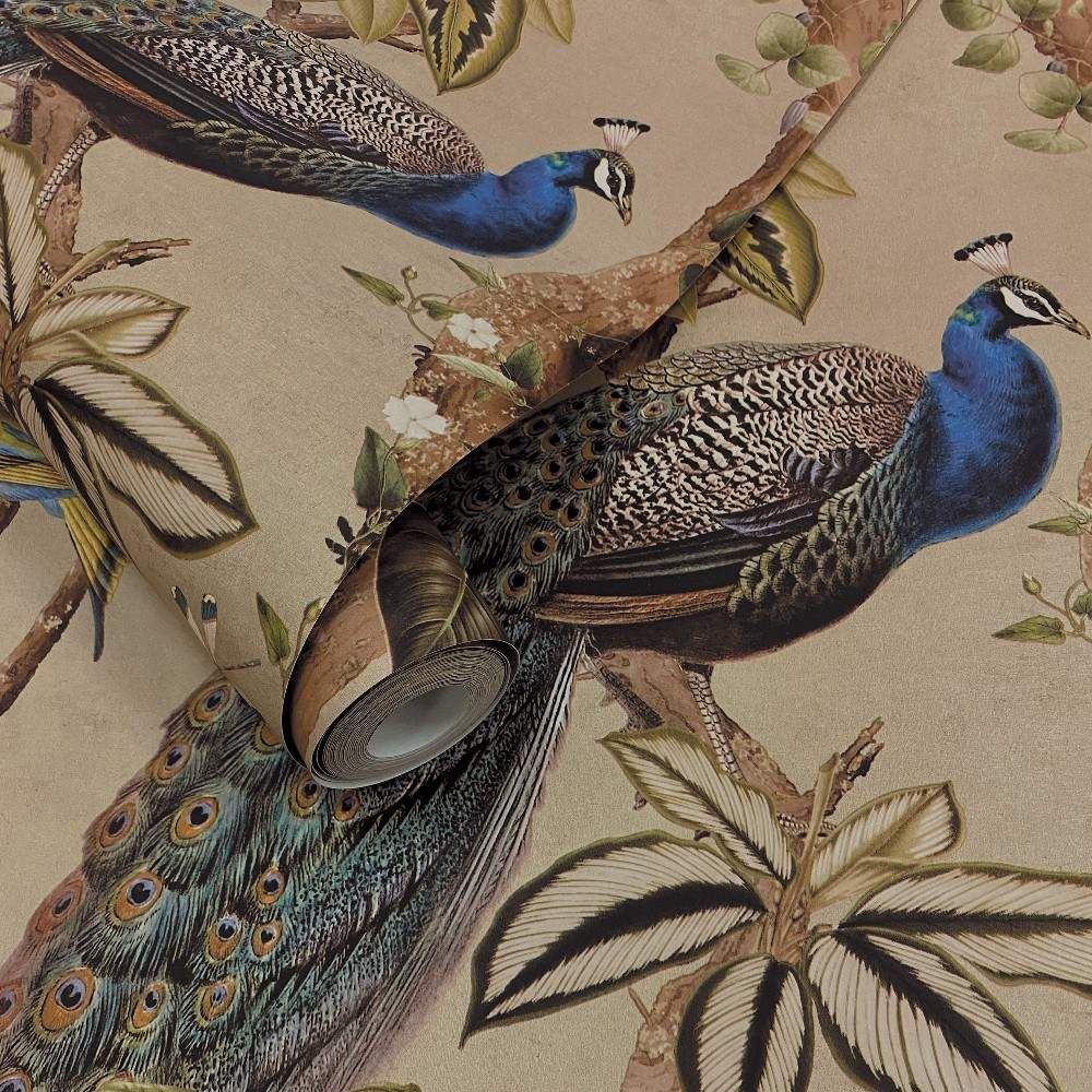 Peacock Woods Taupe Birds Whispering Wilderness Collection Wallpaper 13680