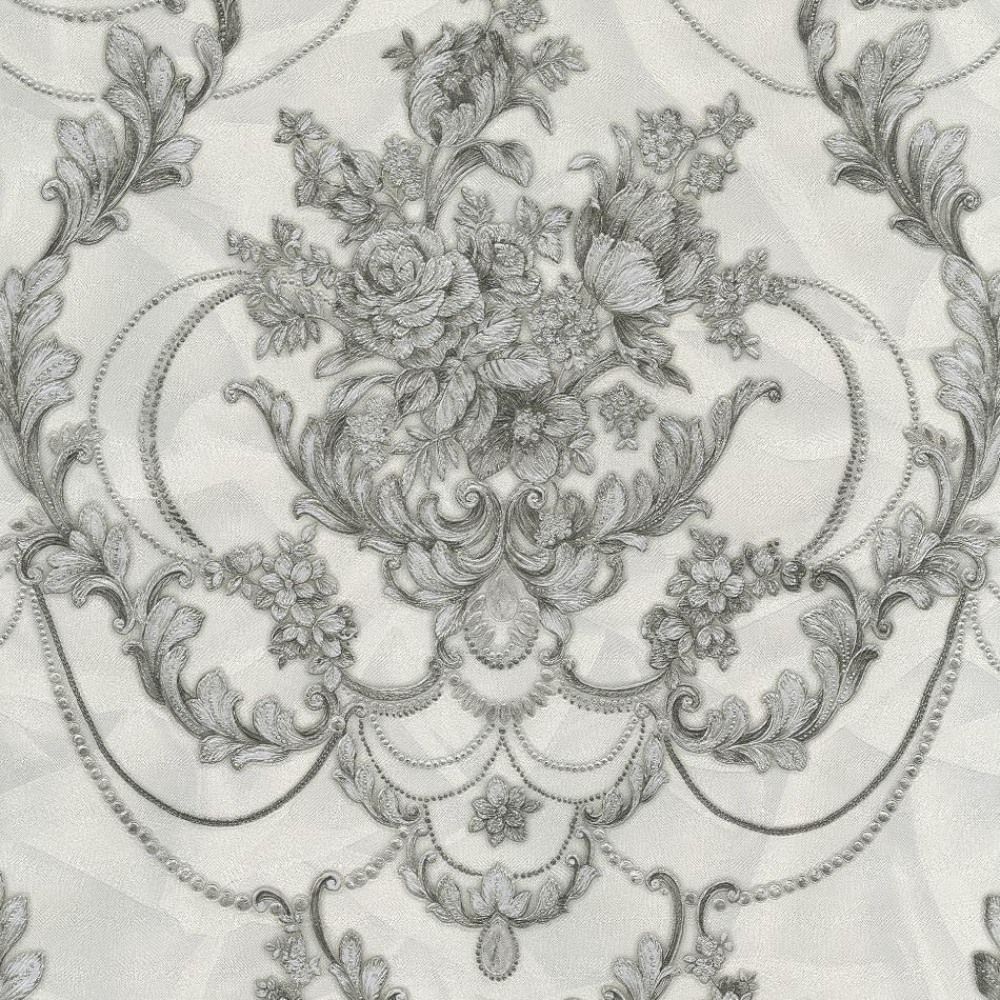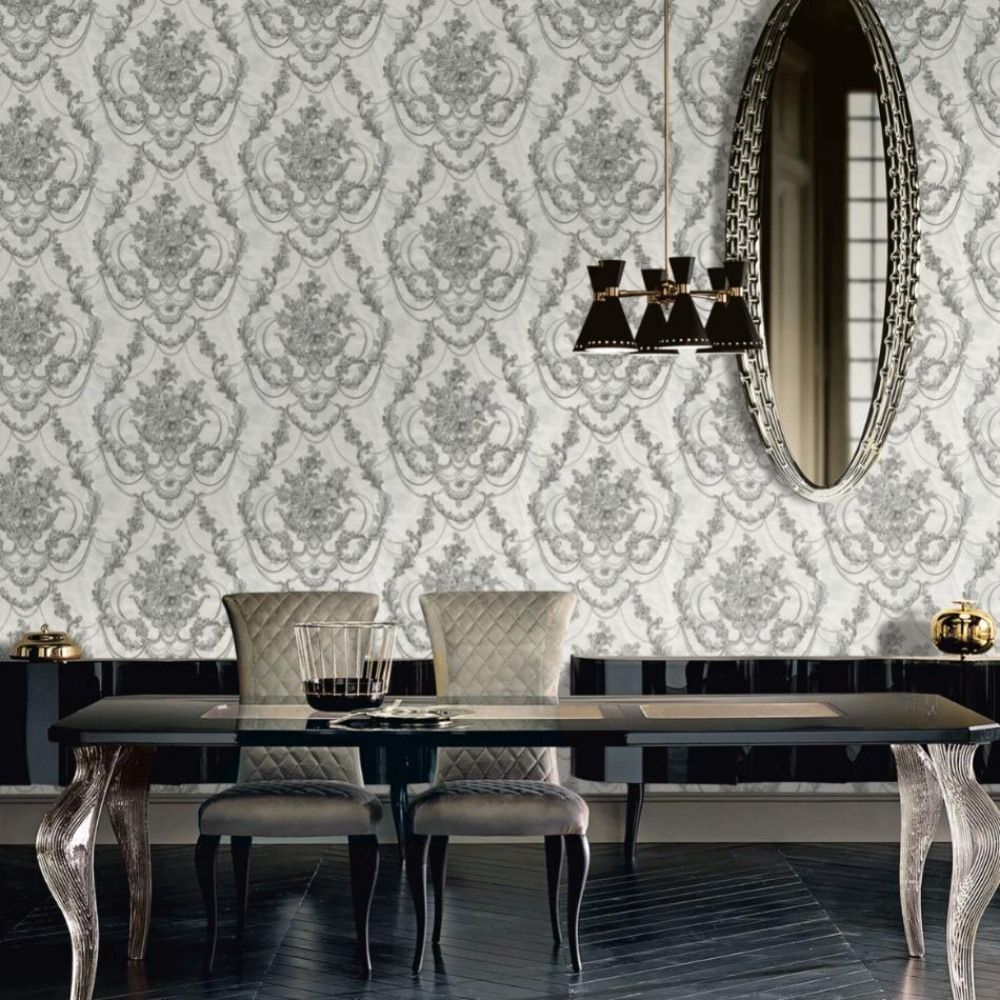Perla II White & Silver Oriental Luxury Damask Vinyl Wallpaper 9085