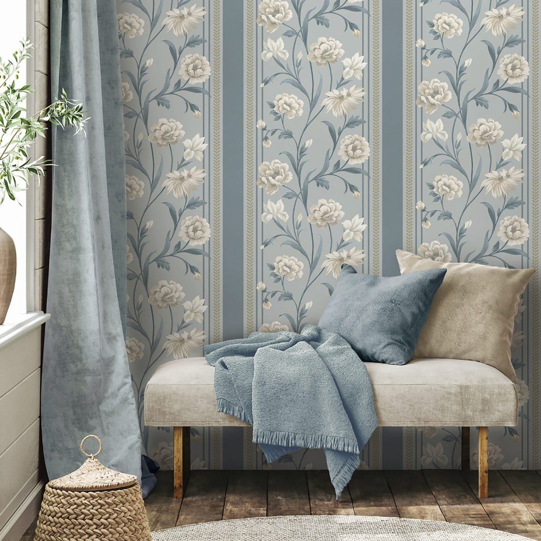 Raya Hand-painted Bridgerton Floral Stripe Blue & Cream Wallpaper 758