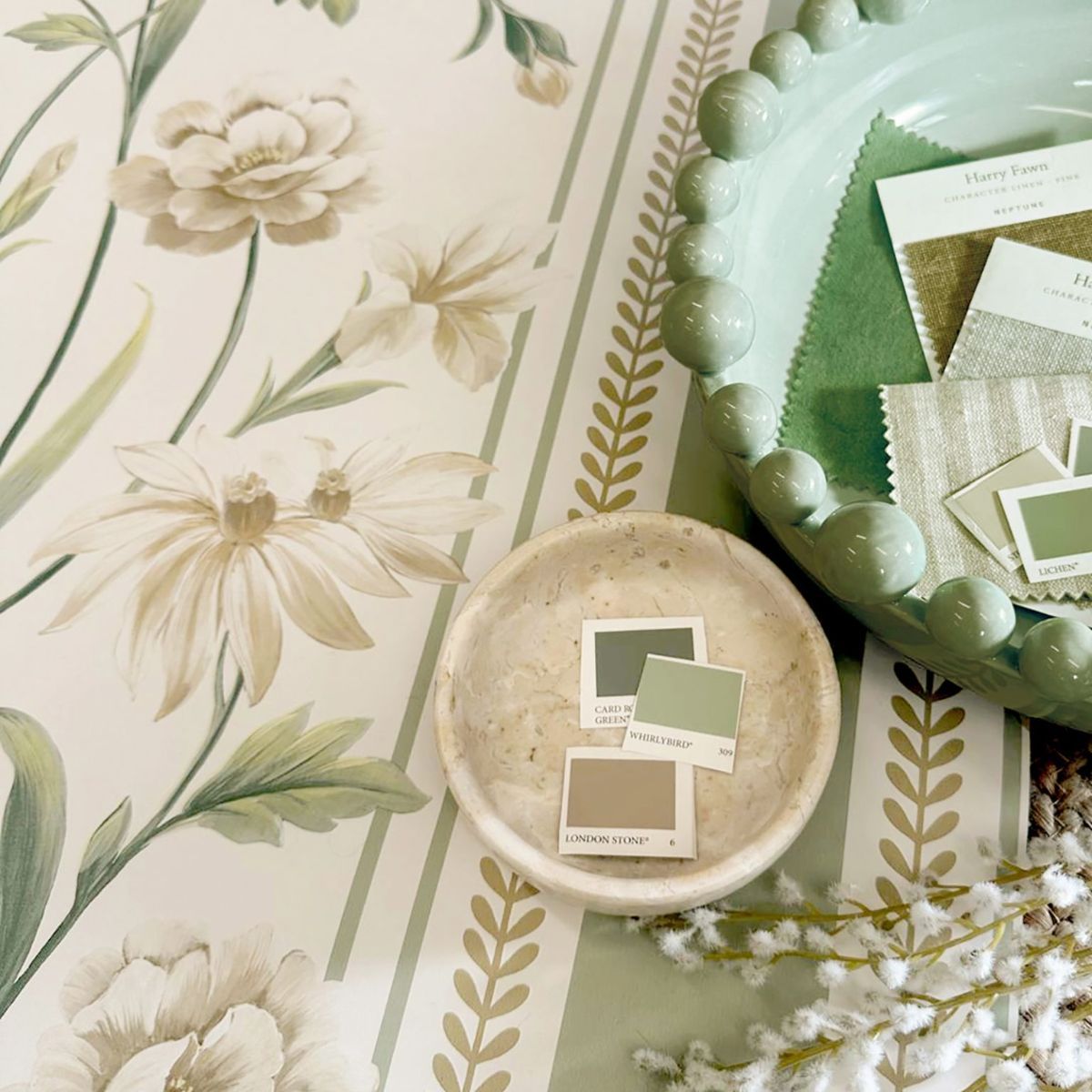 Raya Hand-painted Bridgerton Floral Stripe Sage Green & Cream Wallpaper 756