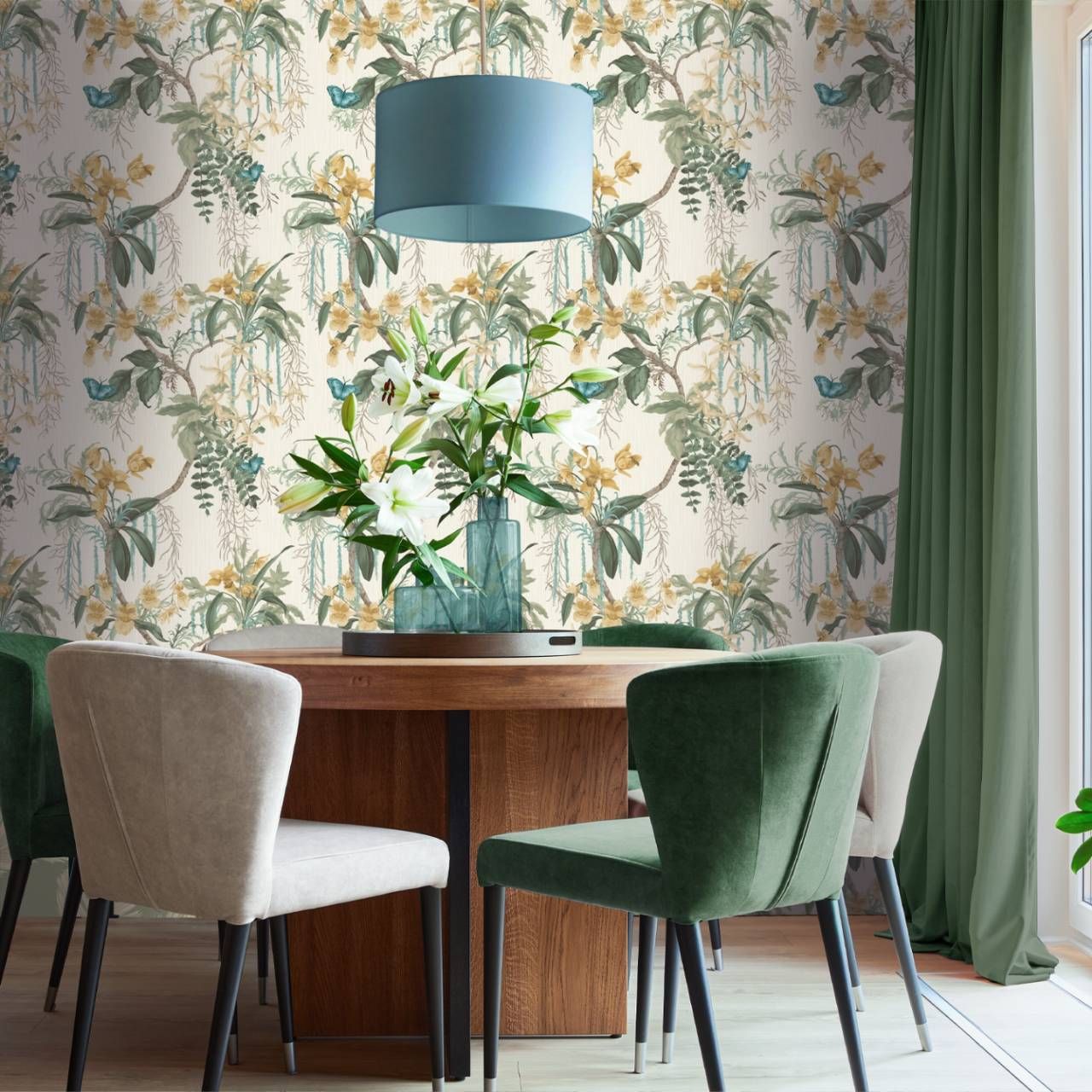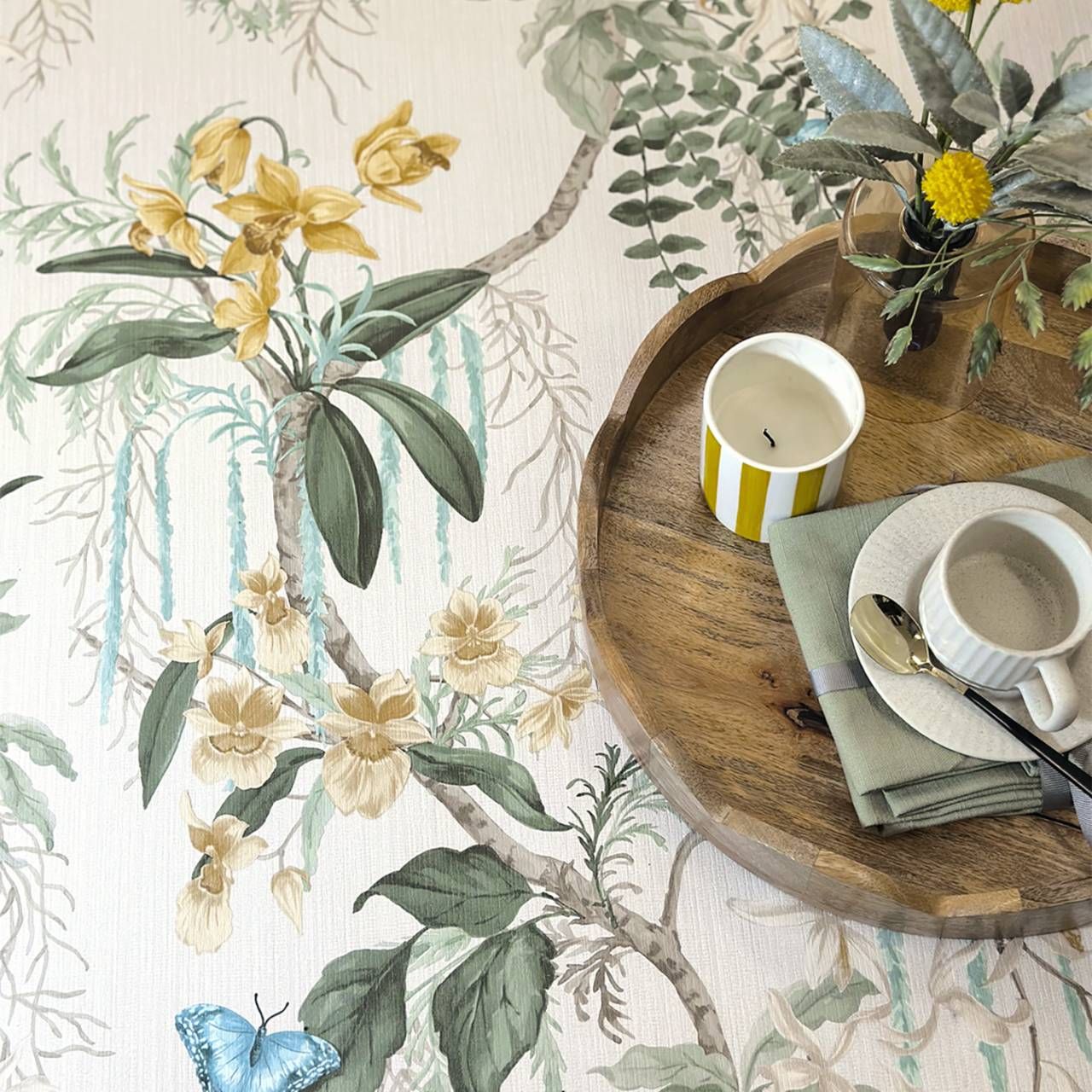 Calculate QuantityAdd a vibrant touch of nature to your space with this oriental-inspired trailing orchid wallcovering. Featuring green and cream tones with lively yellow accents, the design offers a fresh, uplifting look, ideal for spring styling. Pairs effortlessly with SUKI Texture 2164.