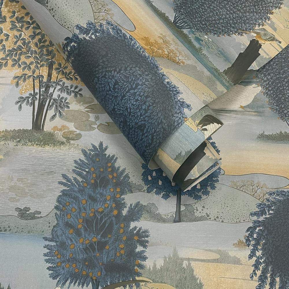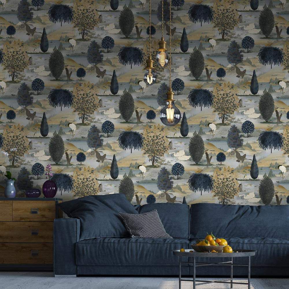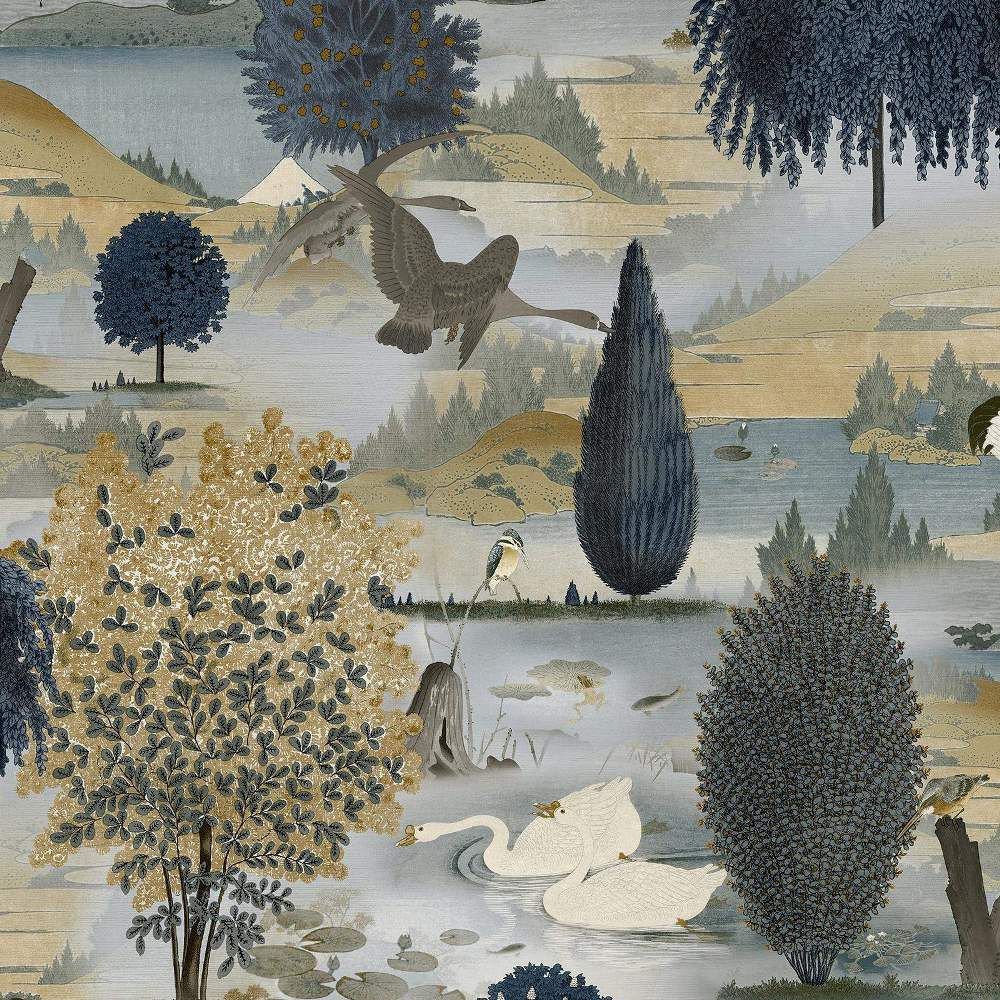 Swan Lake Nature Trees Birds Navy & Ochre Wallpaper 13491