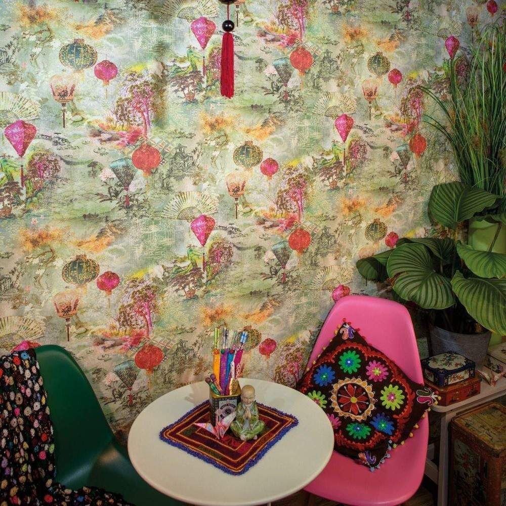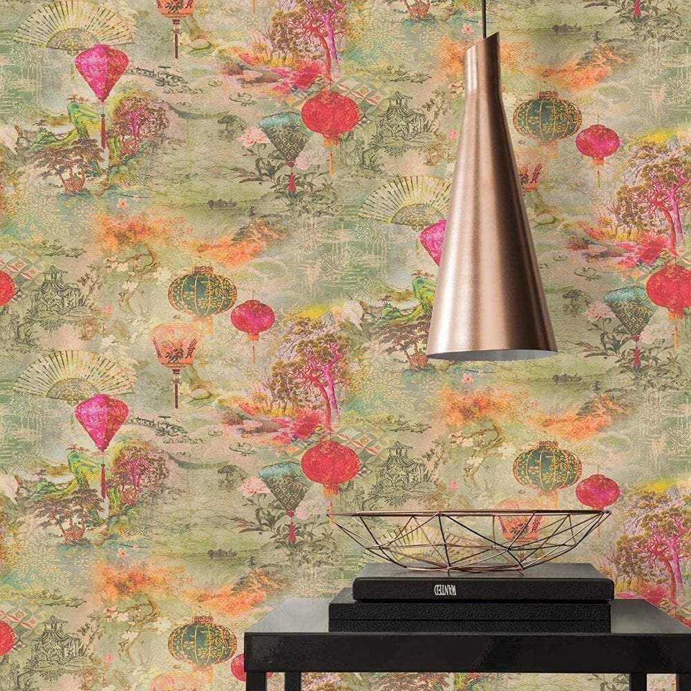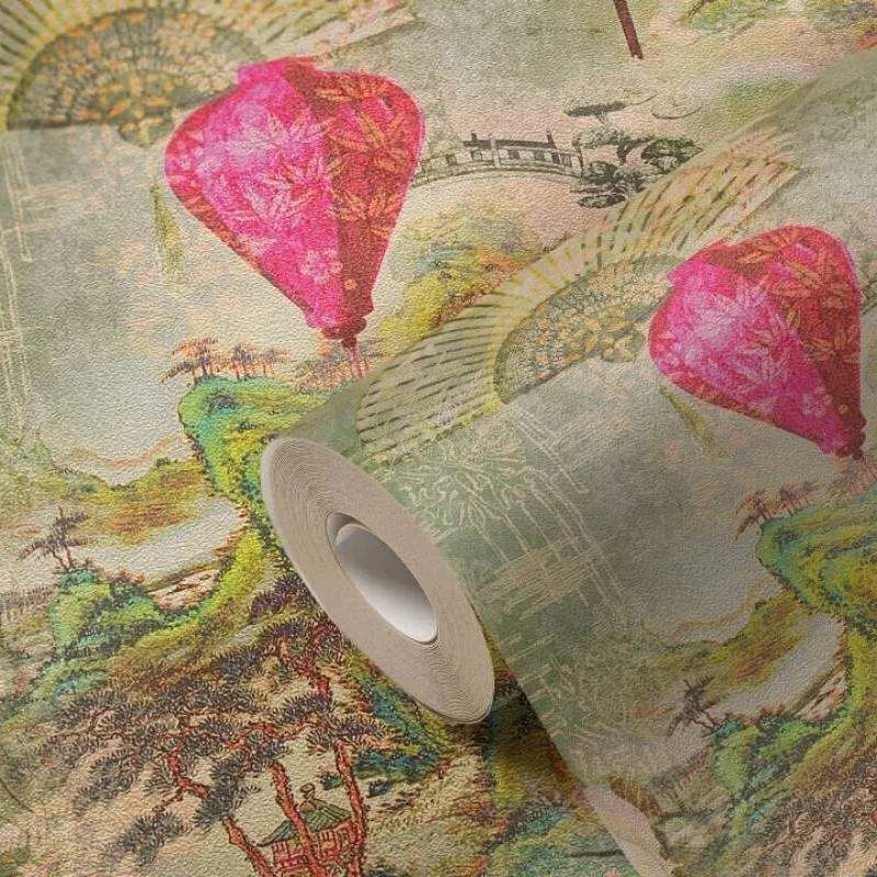 Calculate QuantityThe exquisite design highlights a detailed Oriental-inspired scene with temples, trees, blossoms, and lanterns in harmonious shades of green, pink, red, and yellow, all in a hand-painted style. Easy to apply, this high-quality wallpaper features a lightly textured finish with a subtle sheen, perfect for creating a unique feature wall.