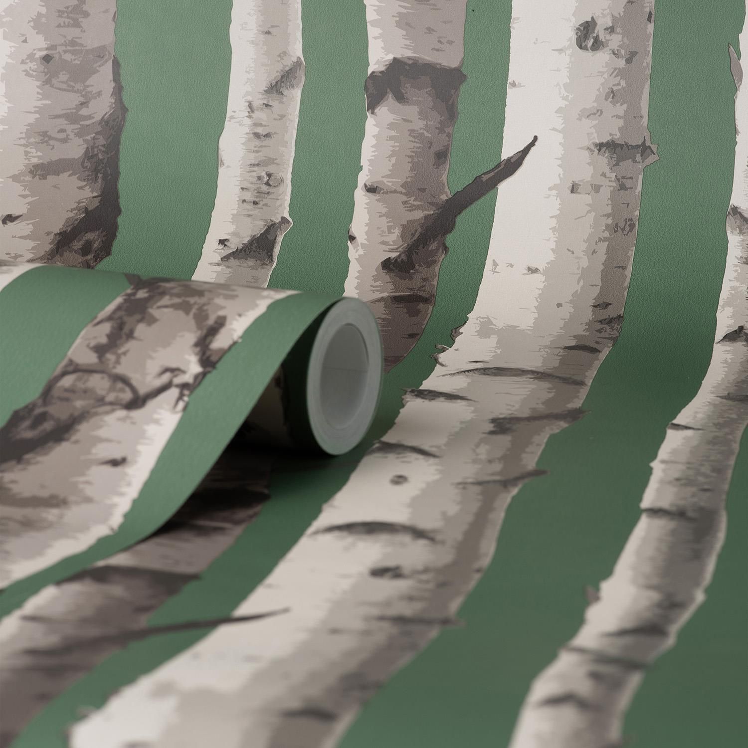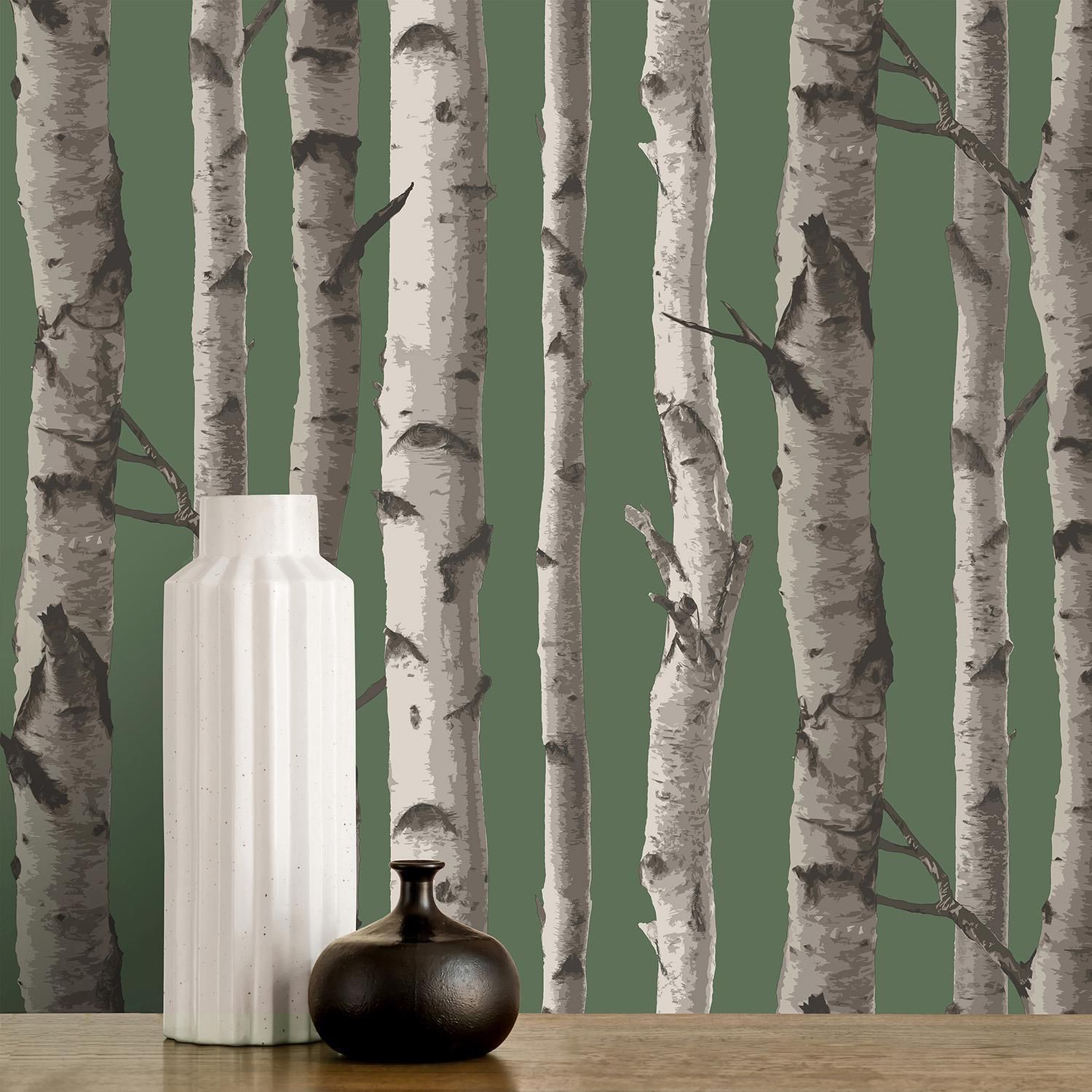 Birch Trees Racing Green and Silver Wallpaper FD43292