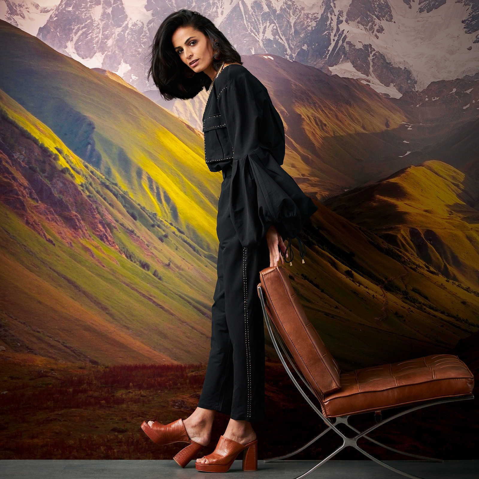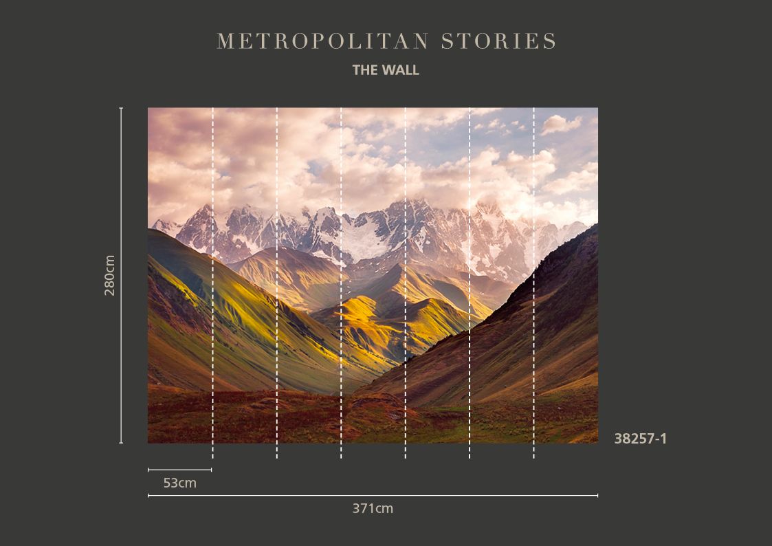 Descending through the valley, as twilight approaches, a sense of tranquillity fills the air. The velvety hilltops stretch out, embracing the warm embrace of the setting sun's rays, while majestic mountains with snow-capped peaks reach towards the cloudy sky. Imagine a captivating mural, spanning across seven panels, measuring an impressive 371x280cm in width and height. With a free pattern match, this mural beautifully captures the breath-taking journey from valley to mountaintop. The seamless flow of the panels creates a sense of continuity, allowing viewers to immerse themselves in the serene beauty of the landscape. The interplay of colours and textures evokes a serene ambiance, with the warm hues of dusk casting a gentle glow on the rolling hills and rugged mountain peaks. This mural transports viewers to a place of tranquillity and natural splendour, where the harmony between land, sky, and light intertwine to create a captivating visual experience.