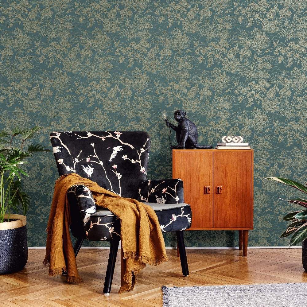 Crane Lagoon Aqua & Metallic Gold Japanese Toile Wallpaper 13732