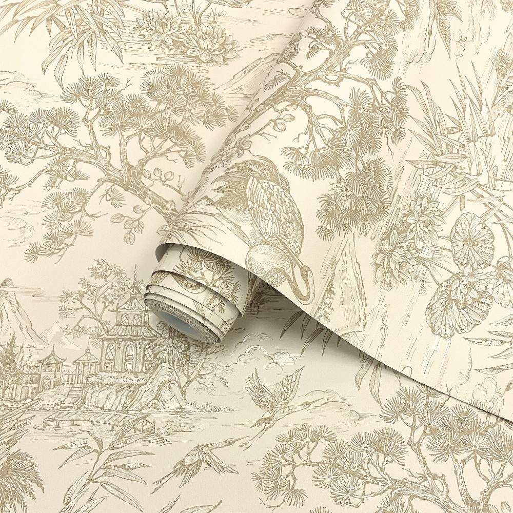 Crane Lagoon Cream Metallic Japanese Toile Wallpaper 13730