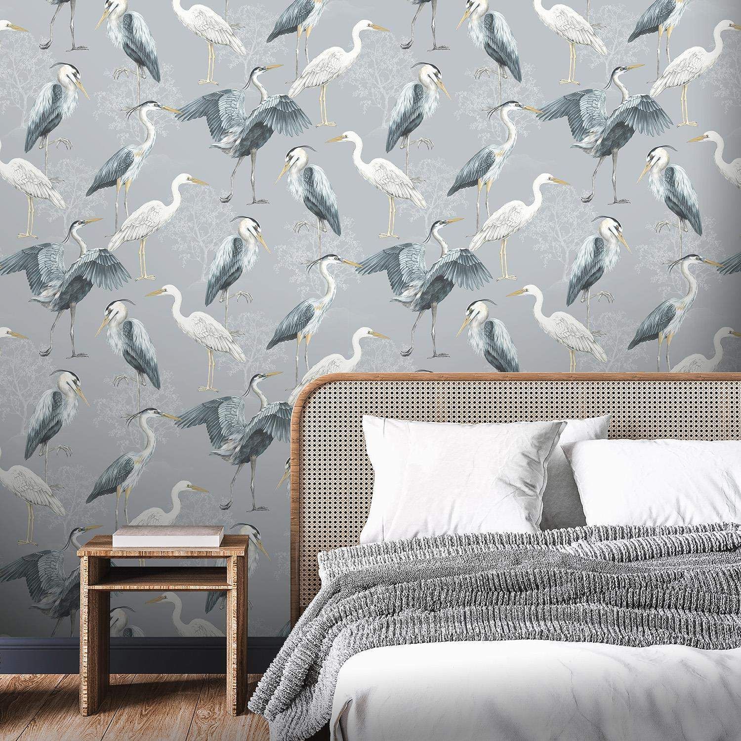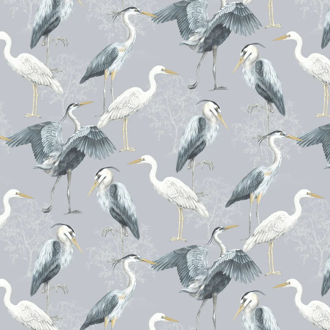 Calculate QuantityHeron Dimension wallpaper from The Design Library's Elegant Homes collection has stylized Herons in various stances as the main focus. The Heron birds, which appear to have been hand painted, are finely detailed with brushstrokes, and they are positioned against a faint tree shape to give the main wallpaper design depth. Heron wallpaper, shown in this example in Blue, is likely to lend an eccentric touch to any room in the house.