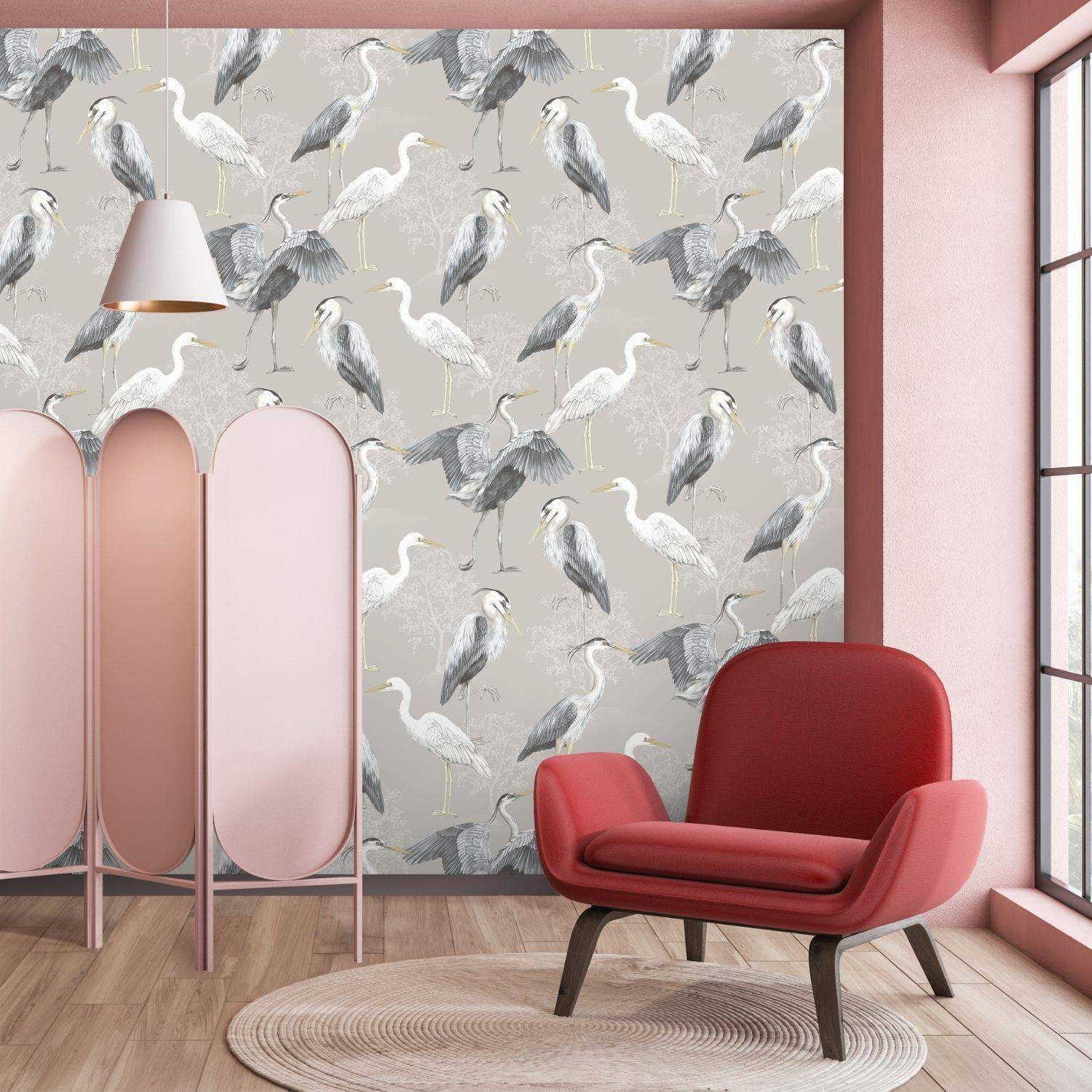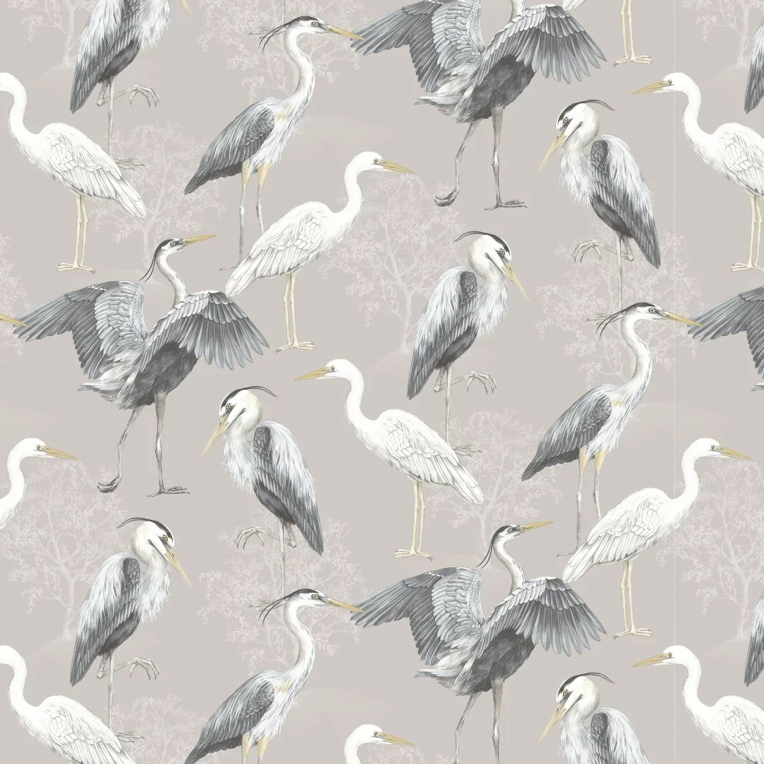 Calculate QuantityHeron Dimension wallpaper from The Design Library's Elegant Homes collection has stylized Herons in various stances as the main focus. The Heron birds, which appear to have been hand painted, are finely detailed with brushstrokes, and they are positioned against a faint tree shape to give the main wallpaper design depth. Heron wallpaper, shown in this example in Greige, is likely to lend an eccentric touch to any room in the house.