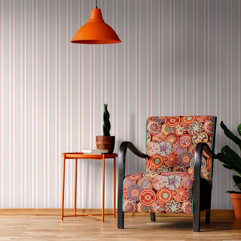 This Dresden inspired wallpaper features a classical stripe themed print. Held together on a sheen effect background, with elements of glitter sprinkled above the stripe. Please purchase a sample for true colour and texture.