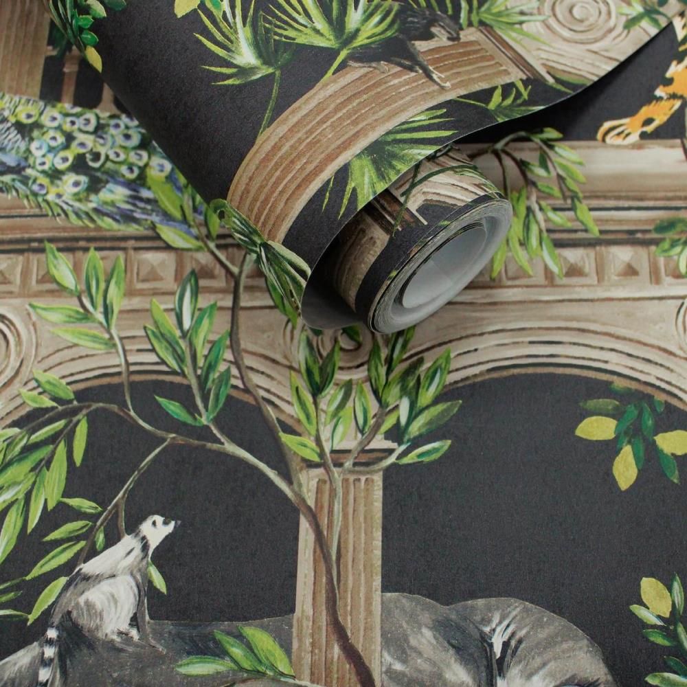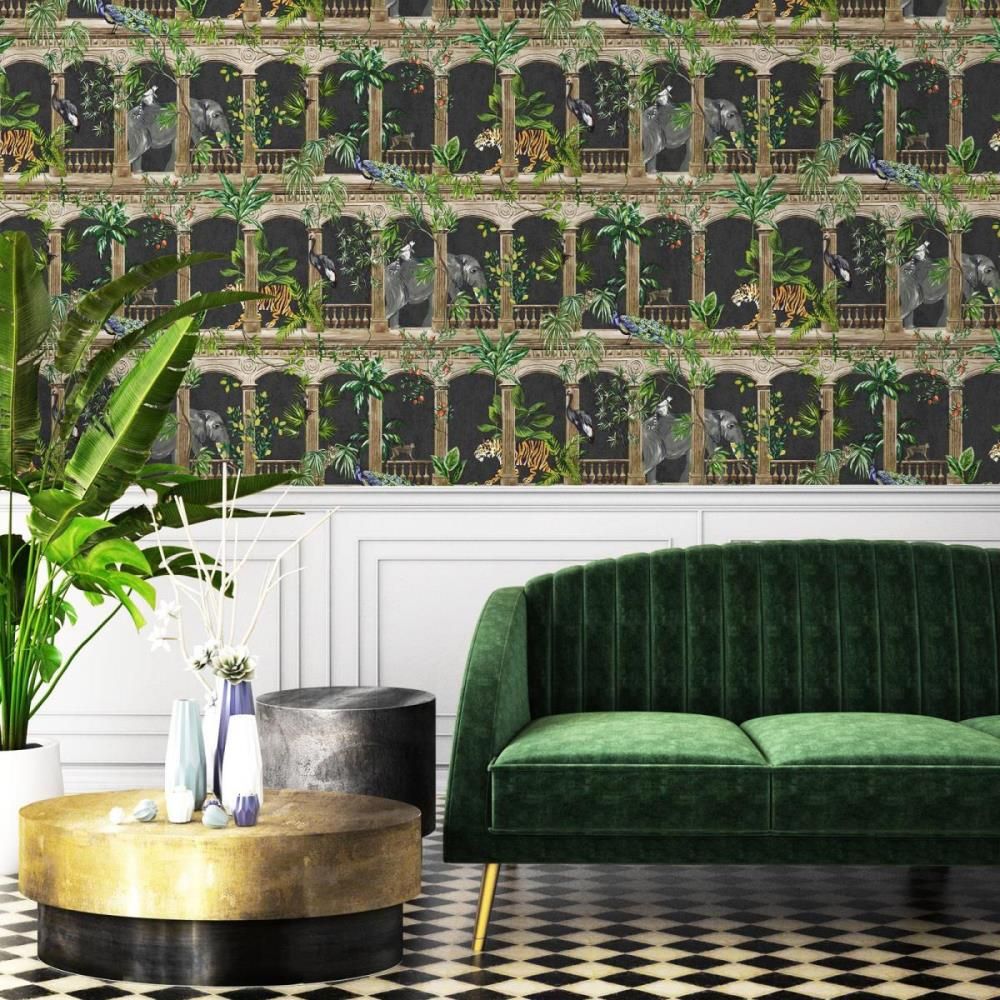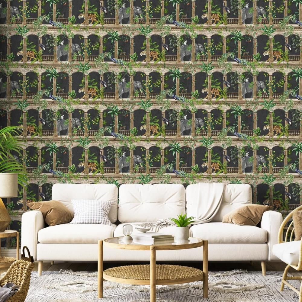 Exotic Animals Arches Black Conversational Wallpaper 13111