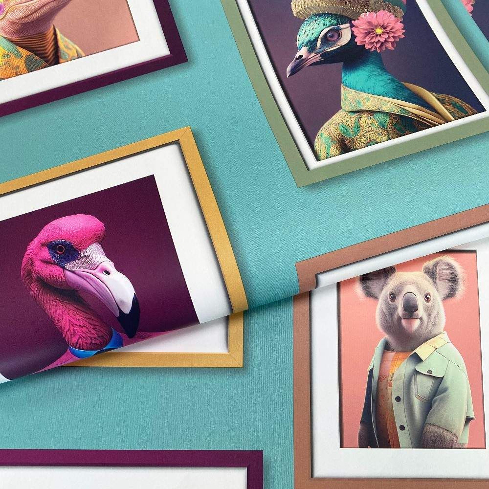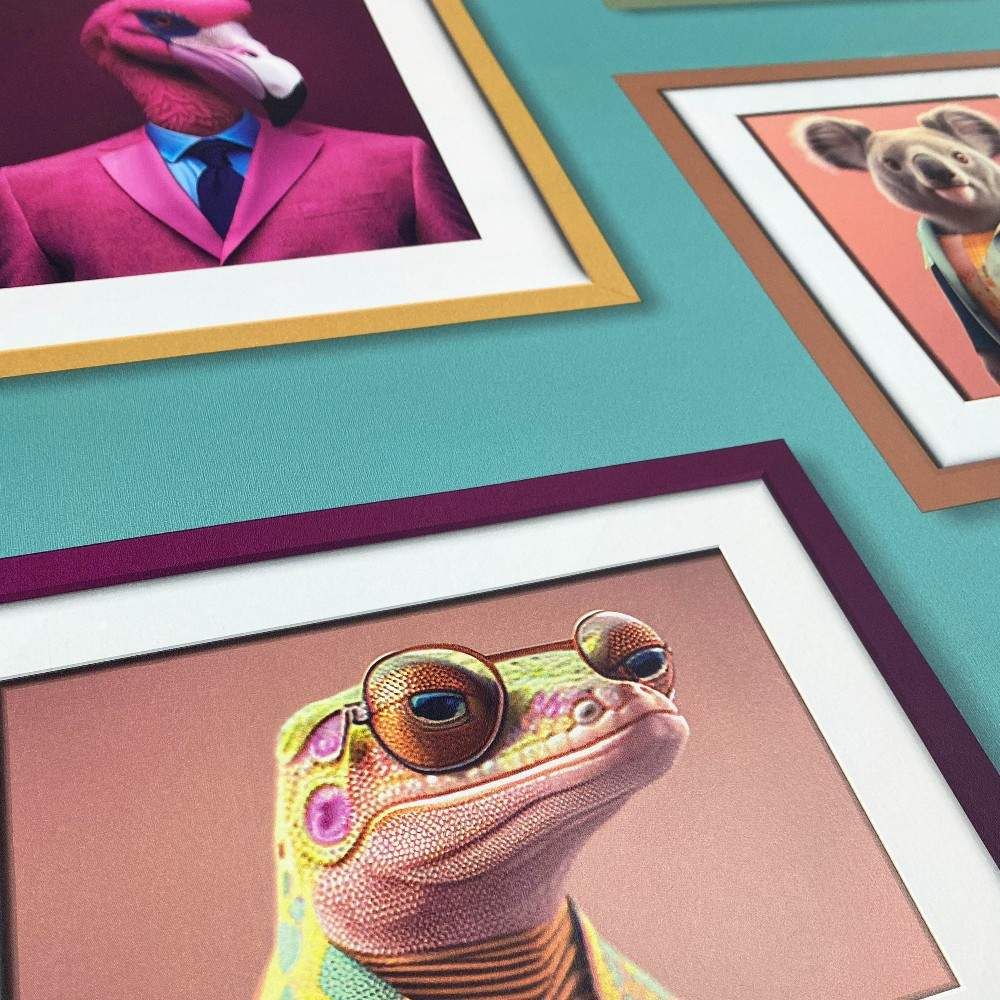 An colourful and light-hearted gallery wall featuring framed animals. This vibrantly coloured design showcases a fashionable peacock and a cute koala. A wonderful feature wall that is sure to make people happy.