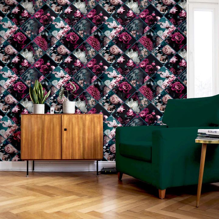Calculate QuantityDark and dramatic, this photographic style wallpaper depicts floral motifs, in contemporary plum and petrol blue tones on a dark black background. This wallpaper will add drama to any room thanks to its striking collage design style and soft glitter finish. This paper is the perfect choice for a feature wall or chimney breast in a bedroom - paired with painted walls to draw the eye to its design. You could also hang it in a cloakroom or living space to get the look you want. Suitable for most rooms except high moisture environments, like bathrooms.