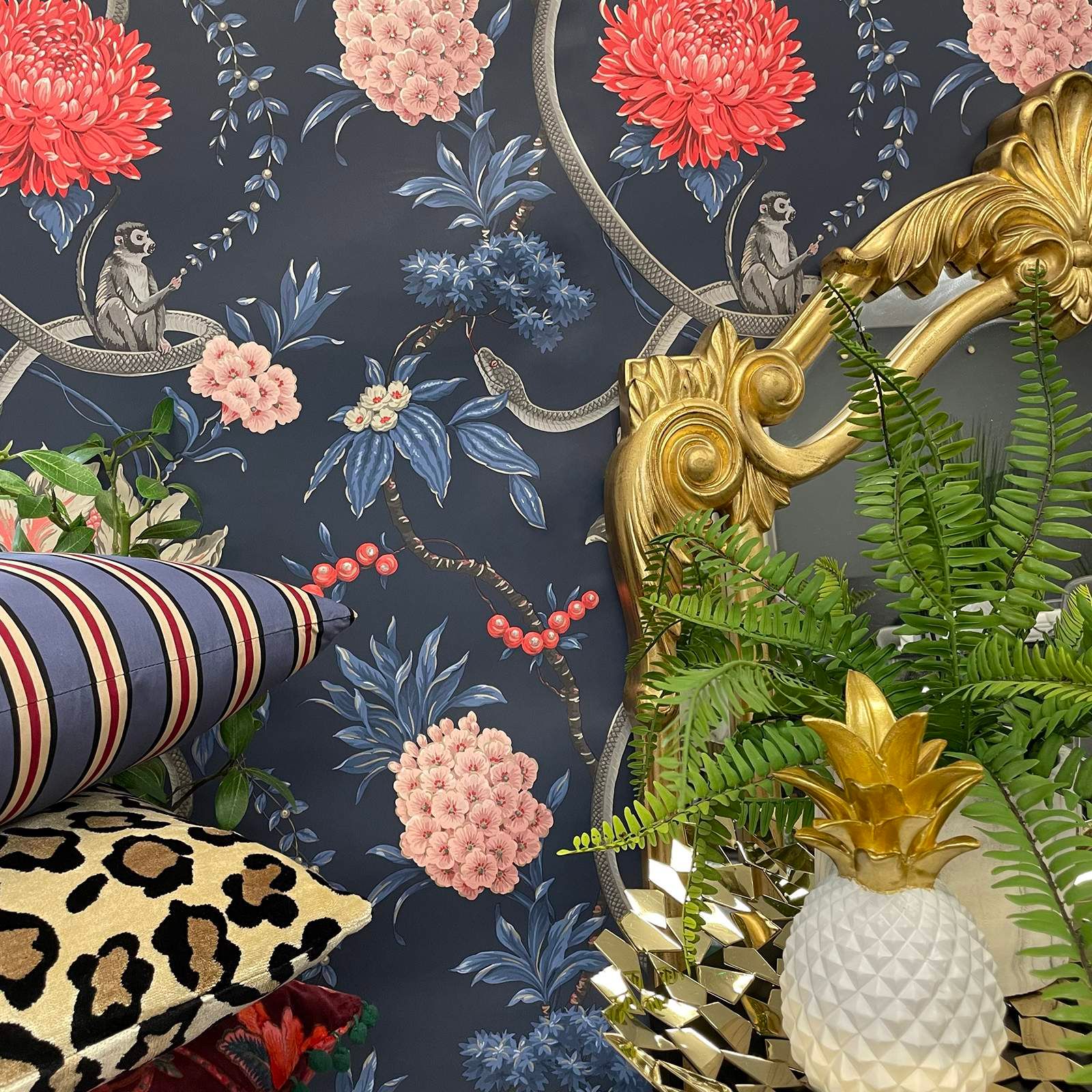 Calculate QuantityIn your home, this lovely Forbidden Fruit Floral Wallpaper will create a striking focus point. On a matte deep blue background, the flowery trail design has subtle metallic touches all over it and displays tropical flowers, leaves, and berries in rich tones of red, pink, beige, and blue intertwined with snakes and monkeys. This premium paper is smooth, easy to apply, and would look fantastic when used to line a whole room or to create a spectacular feature wall.