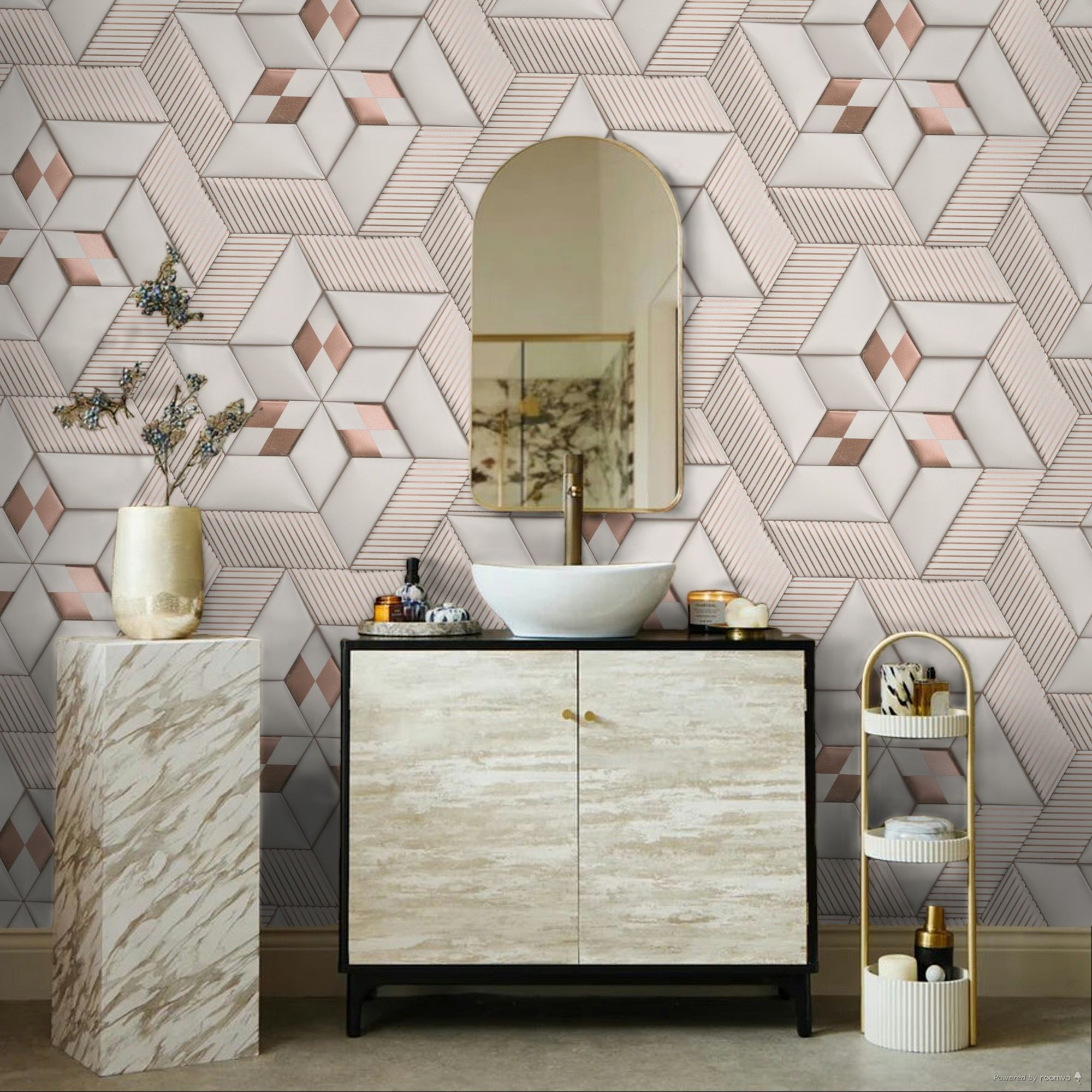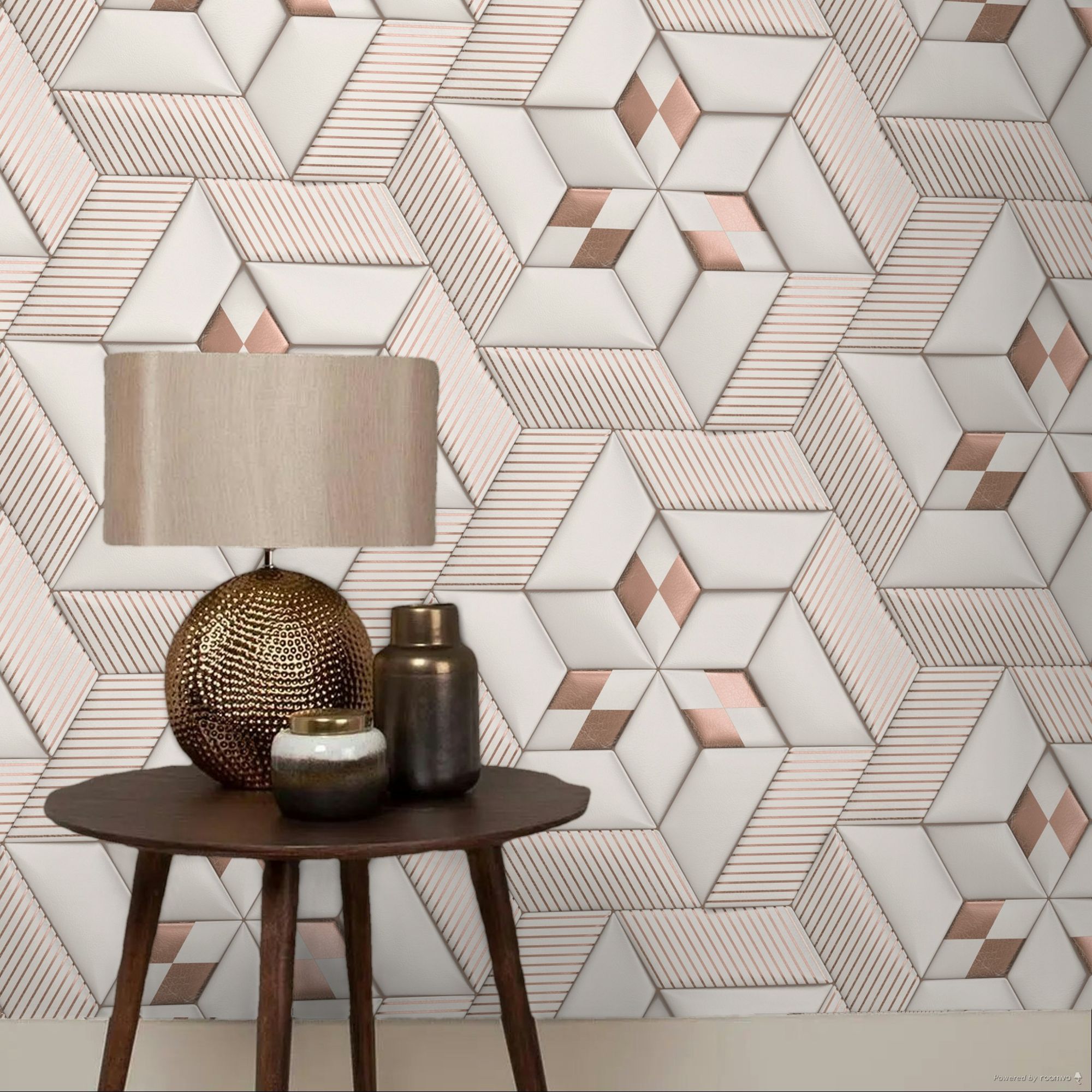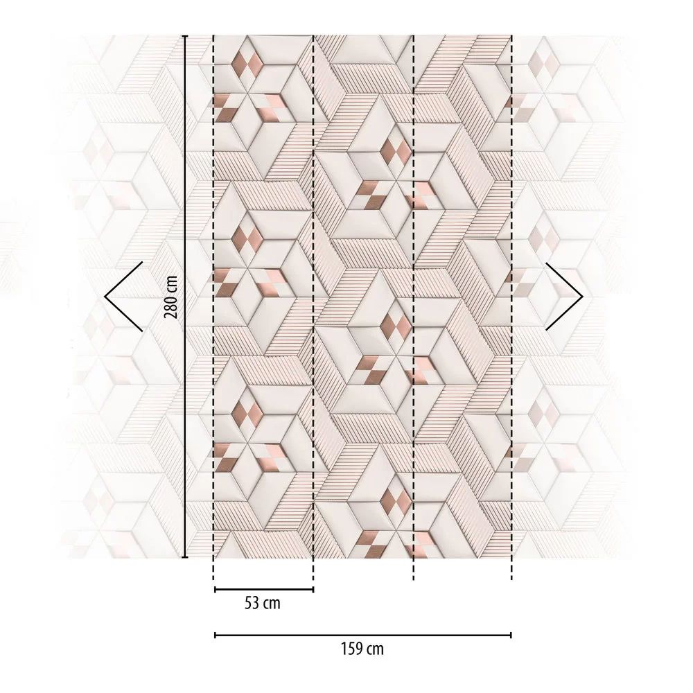 Calculate QuantityThis wallpaper features a striking and modern geometric design with a three-dimensional effect. The four-sided shapes form an intricate star pattern, accented with metallic rose gold highlights for added depth and elegance. It is provided in three 2.8-meter lengths on a 53cm wide roll, with a mural that creates a continuous, side-to-side repeating image.