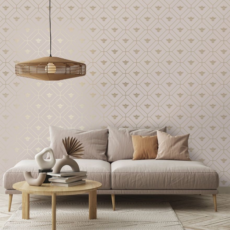 Honeycomb Bee Pink Geometric Metallic Gold Wallpaper 13083