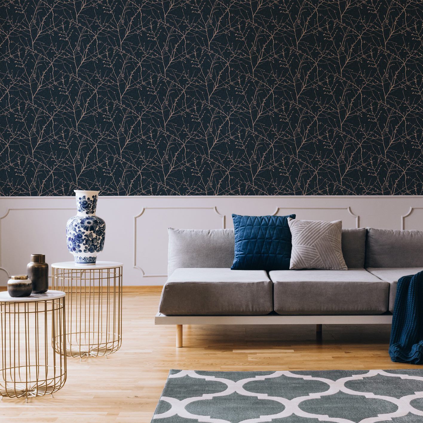 Calculate QuantityThis elegant design is part of Graham and Brown's boutique range, featuring a tranquil natural twig pattern complemented by a stunning ombre mica effect and delicate calico fabric texture. It is available in various organic colours, shown here in a navy shade paired with rose gold accents, to bring a touch of sophistication and luxury to any room.