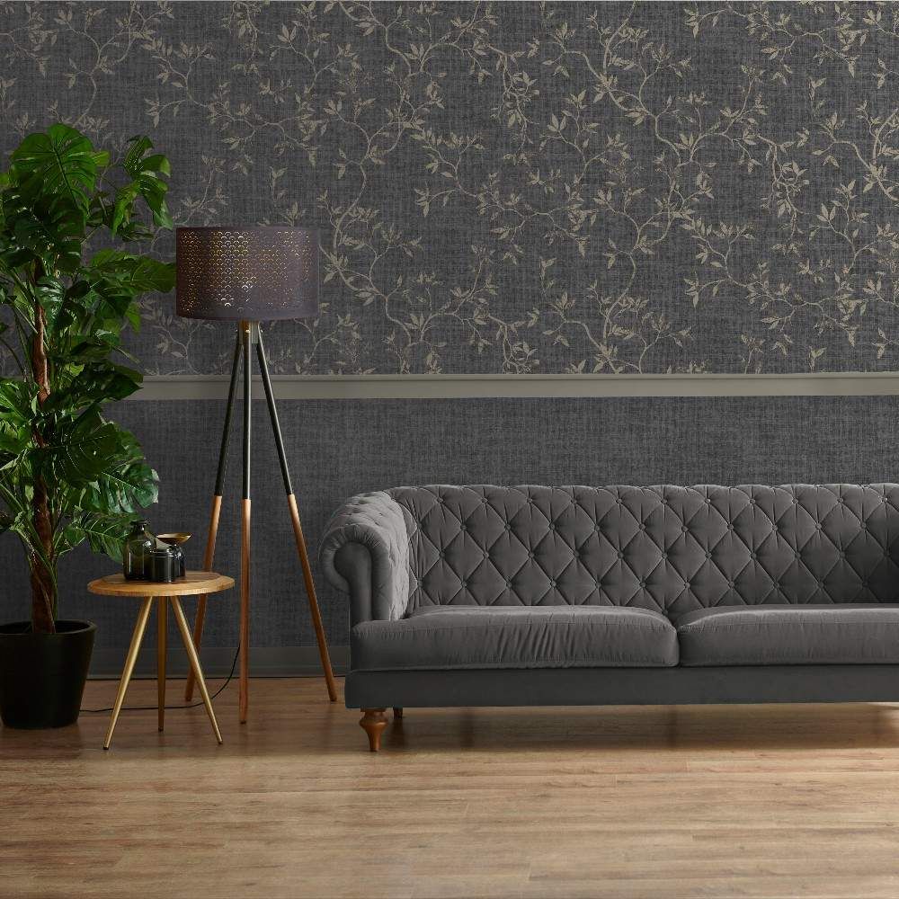 Japandi Leaf Charcoal & Metallic Gold Floral Darcy James Wallpaper 173572