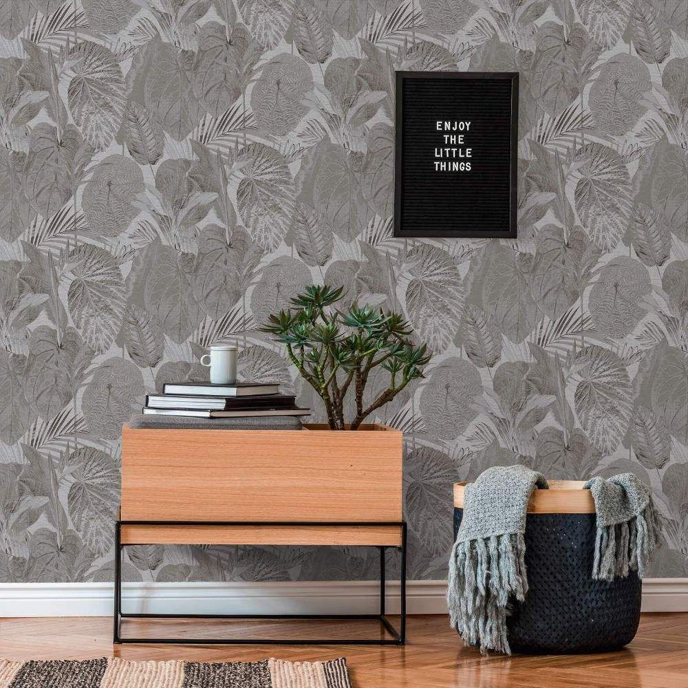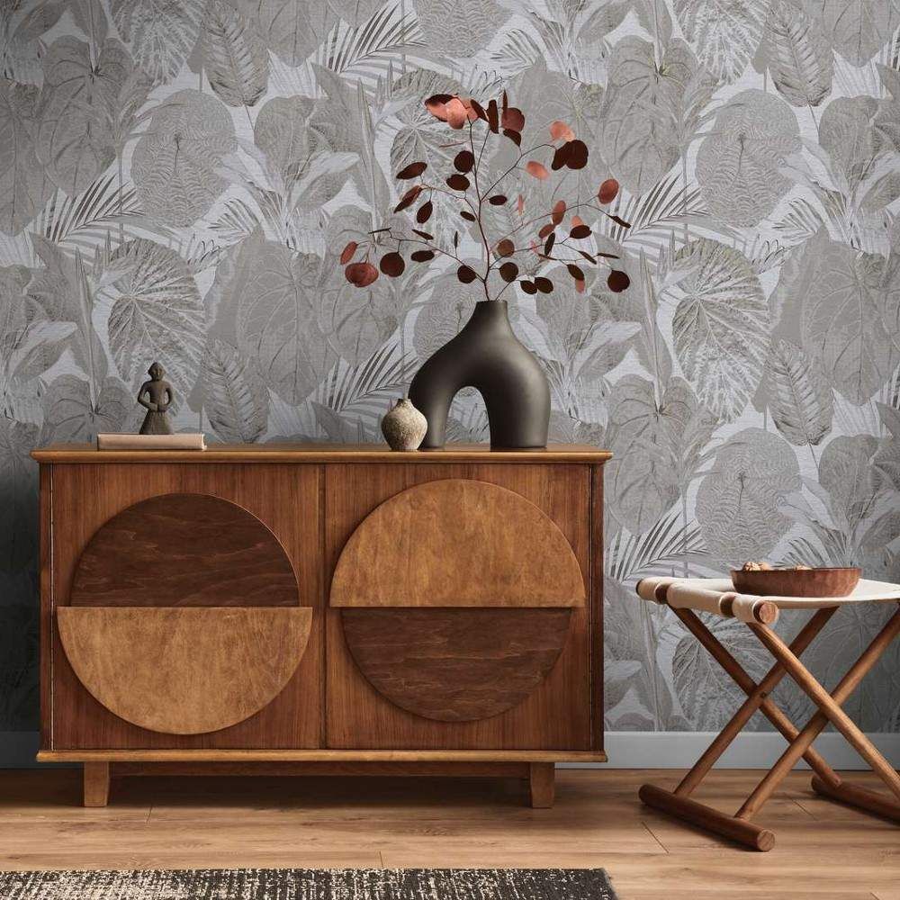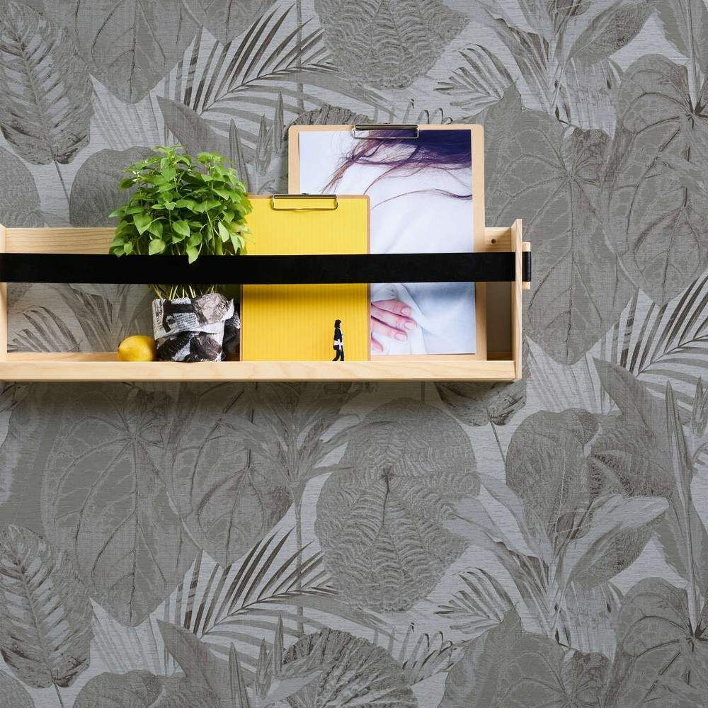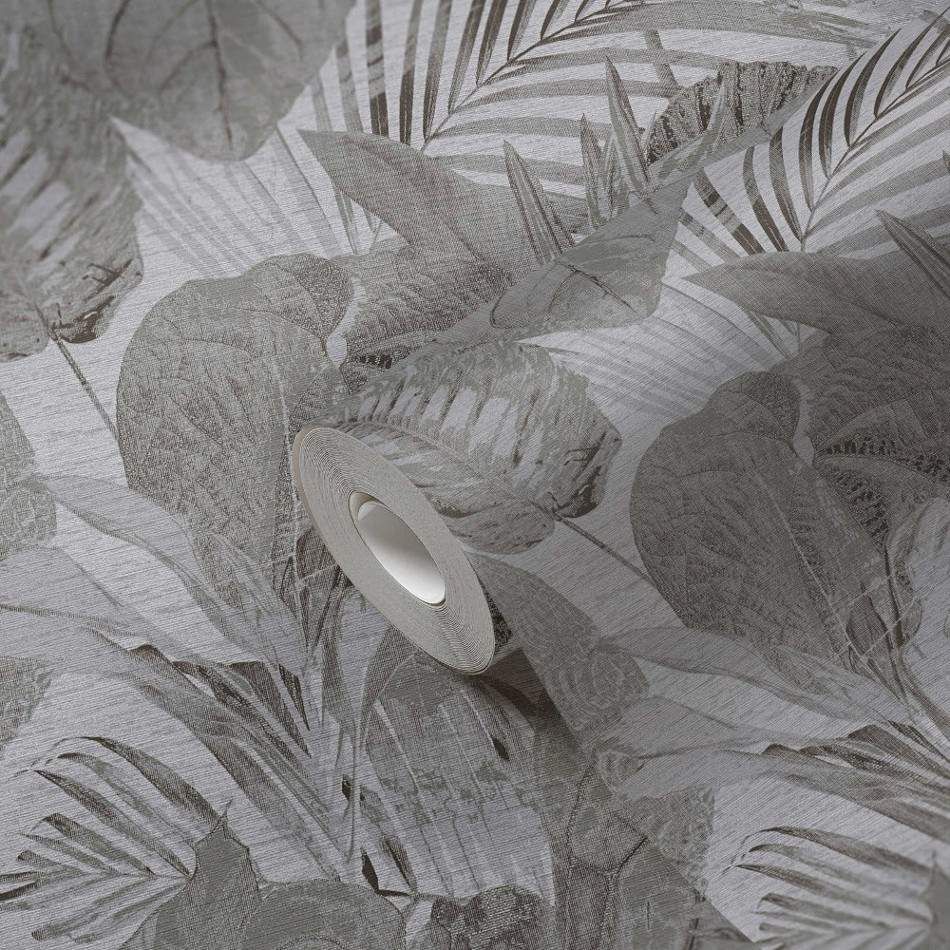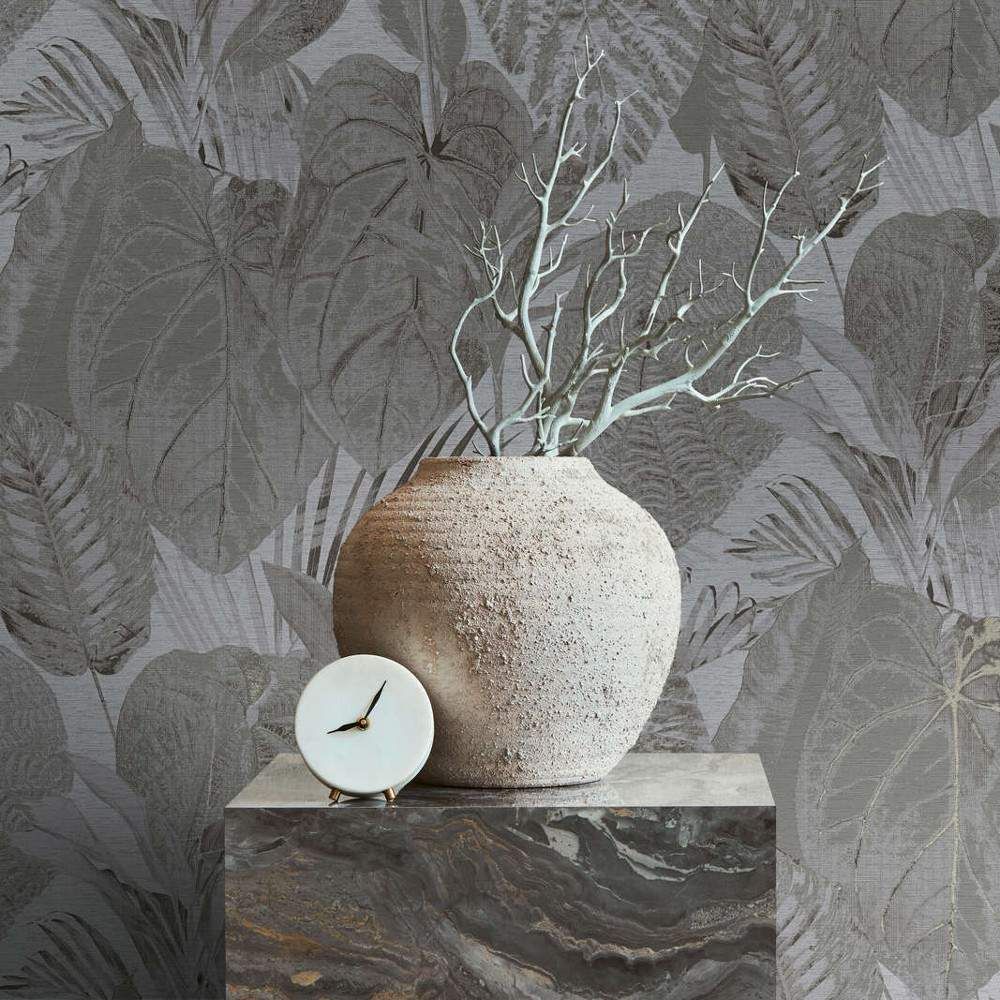 Jungle Silk Bold Leafy Floral Shadow Grey Brown Vinyl Wallpaper 39355-5