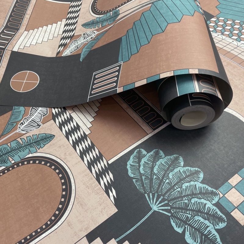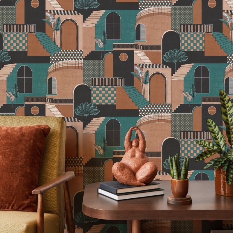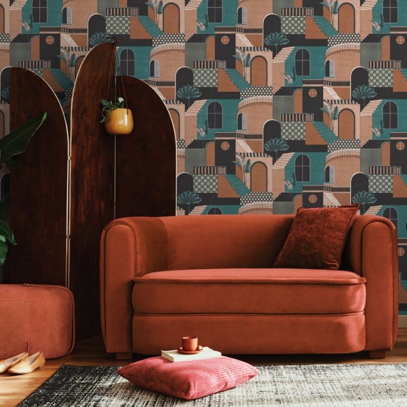 Medina Mediterranean Orange/Teal Conversational Wallpaper 13101