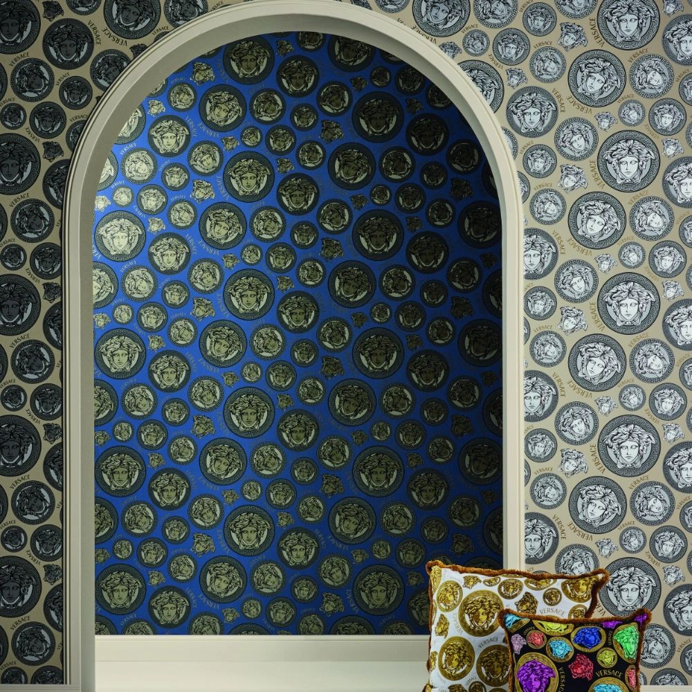 Bold and daring, this vividly printed wallpaper brings the recognizable Versace attitude to home decor. Part of the Medusa Heads wallpaper collection, this design features a mix of Medusa heads and VERSACE logos throughout.