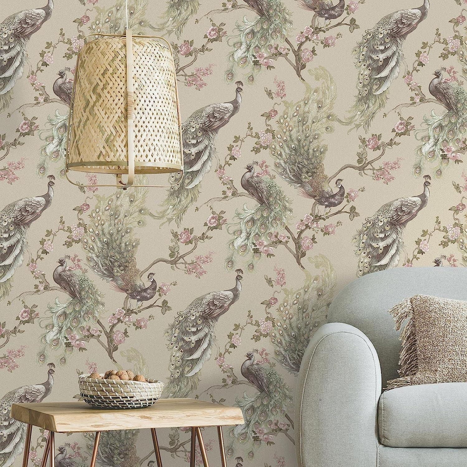 Calculate QuantityYour home will feel more glam with the addition of this lovely Menali Peacock Wallpaper. In addition to a gorgeous flower trail pattern in rich, brilliant shades of beige, the design includes a variety of intricate peacocks. This has a taupe backdrop, a softly textured feel, and is covered in glitter all throughout. This high-quality, heavyweight paper is simple to use and would look equally beautiful when used to adorn a whole room or as a magnificent focal wall.
