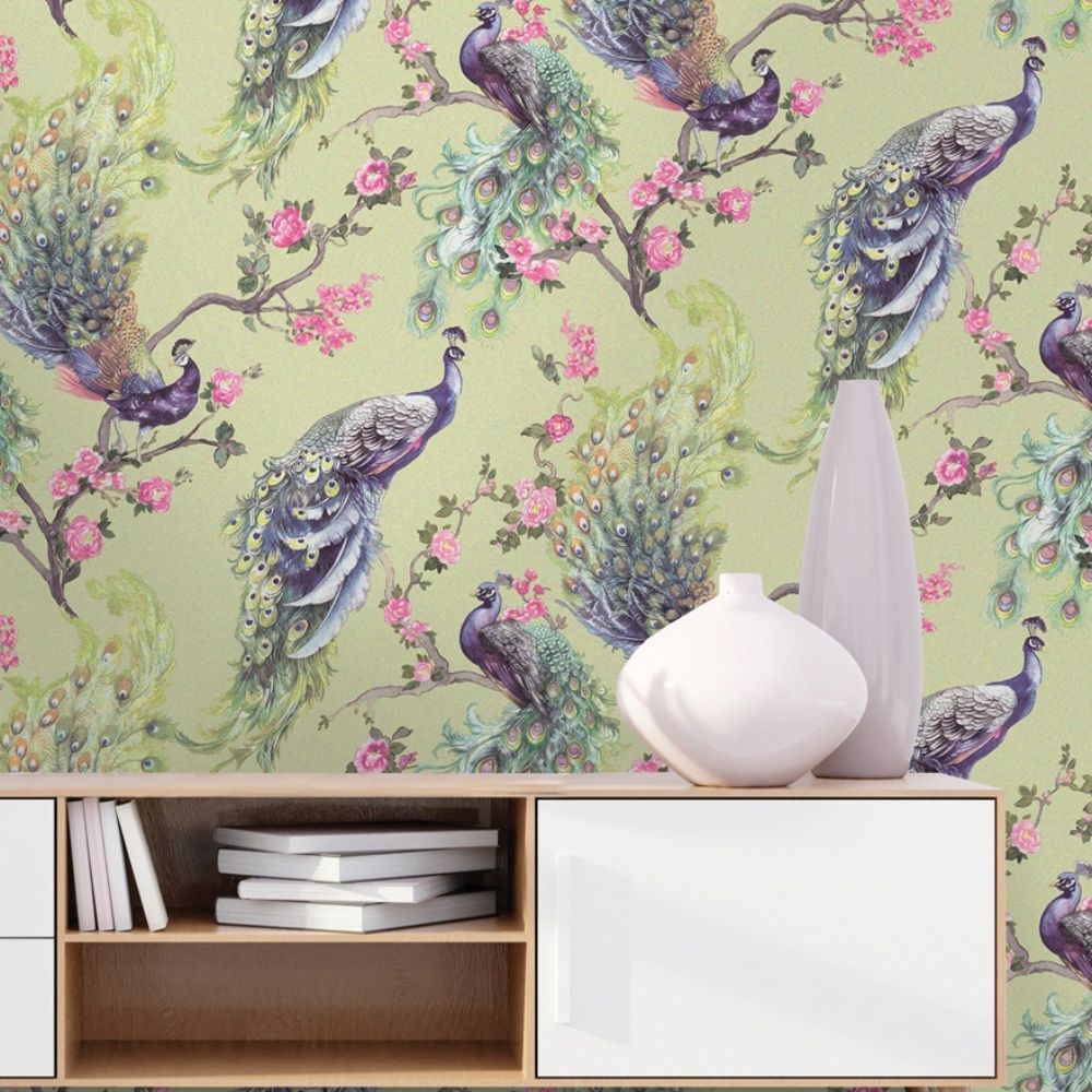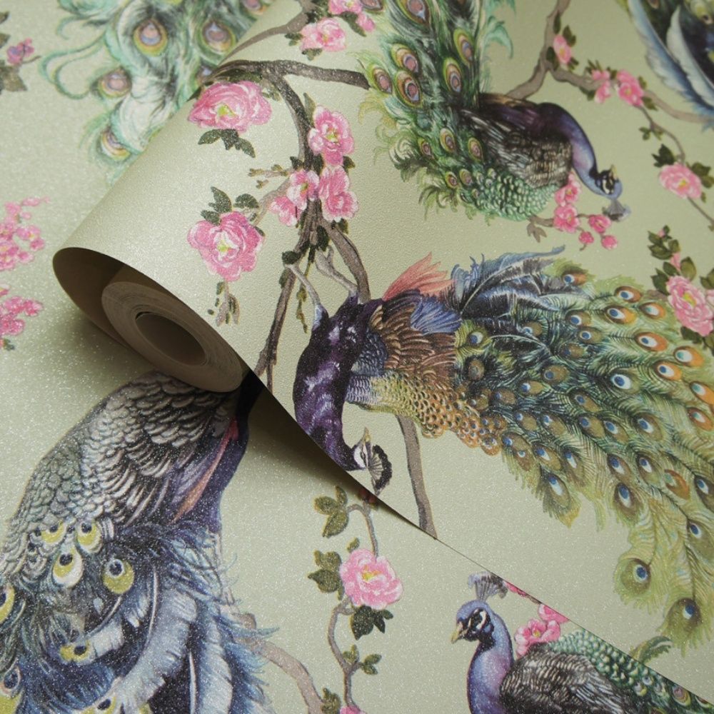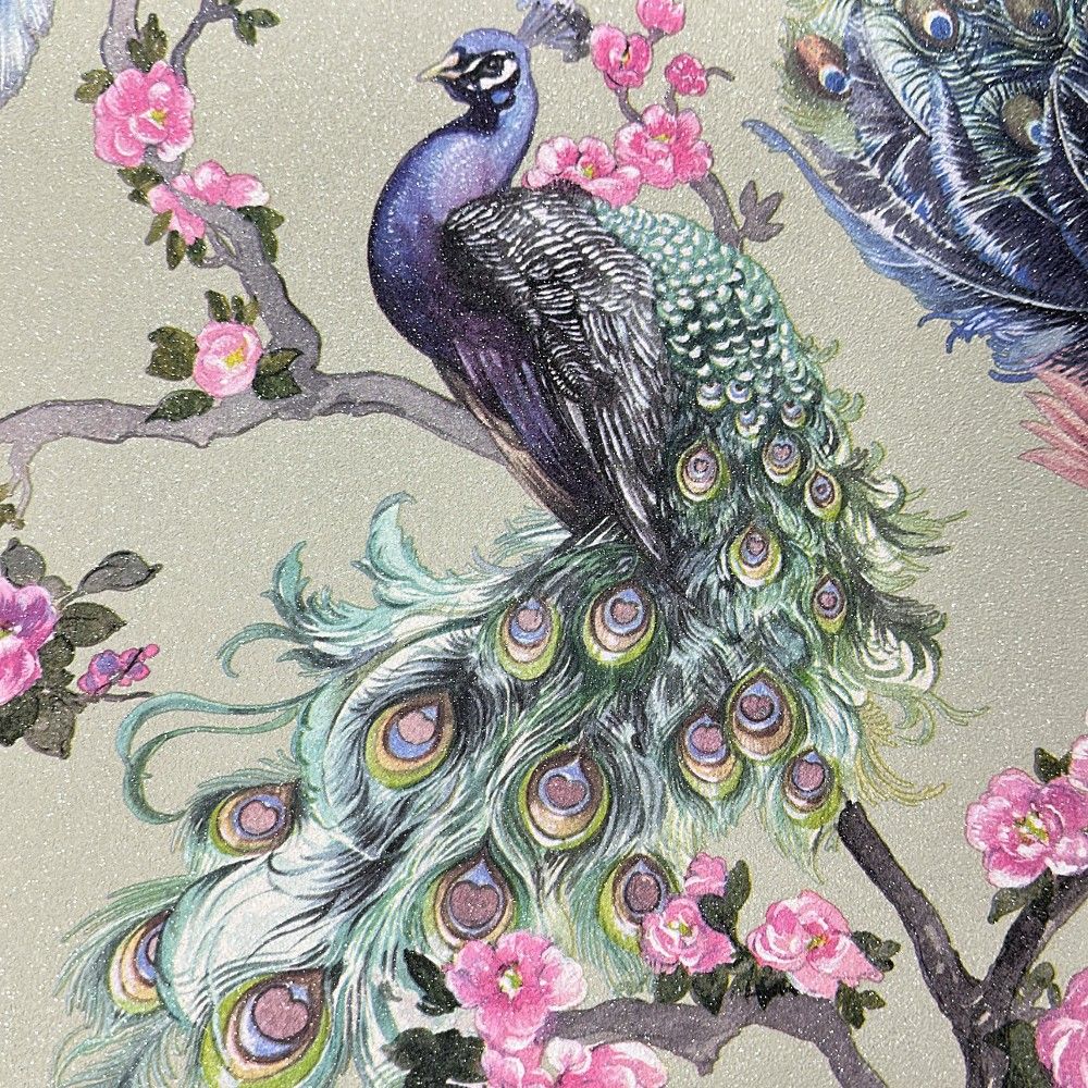 Calculate QuantityBy using this stunning Menali Peacock Wallpaper, your home will seem more elegant. Intricate peacocks are interspersed throughout the pattern, which also has a stunning flower trail pattern in vivid, rich tones of green and pink. This is completely coated in glitter and has a green background. It also feels lightly textured. It's easy to use, high-quality, heavyweight paper that looks stunning whether it's used to decorate a whole room or a stunning focus wall.