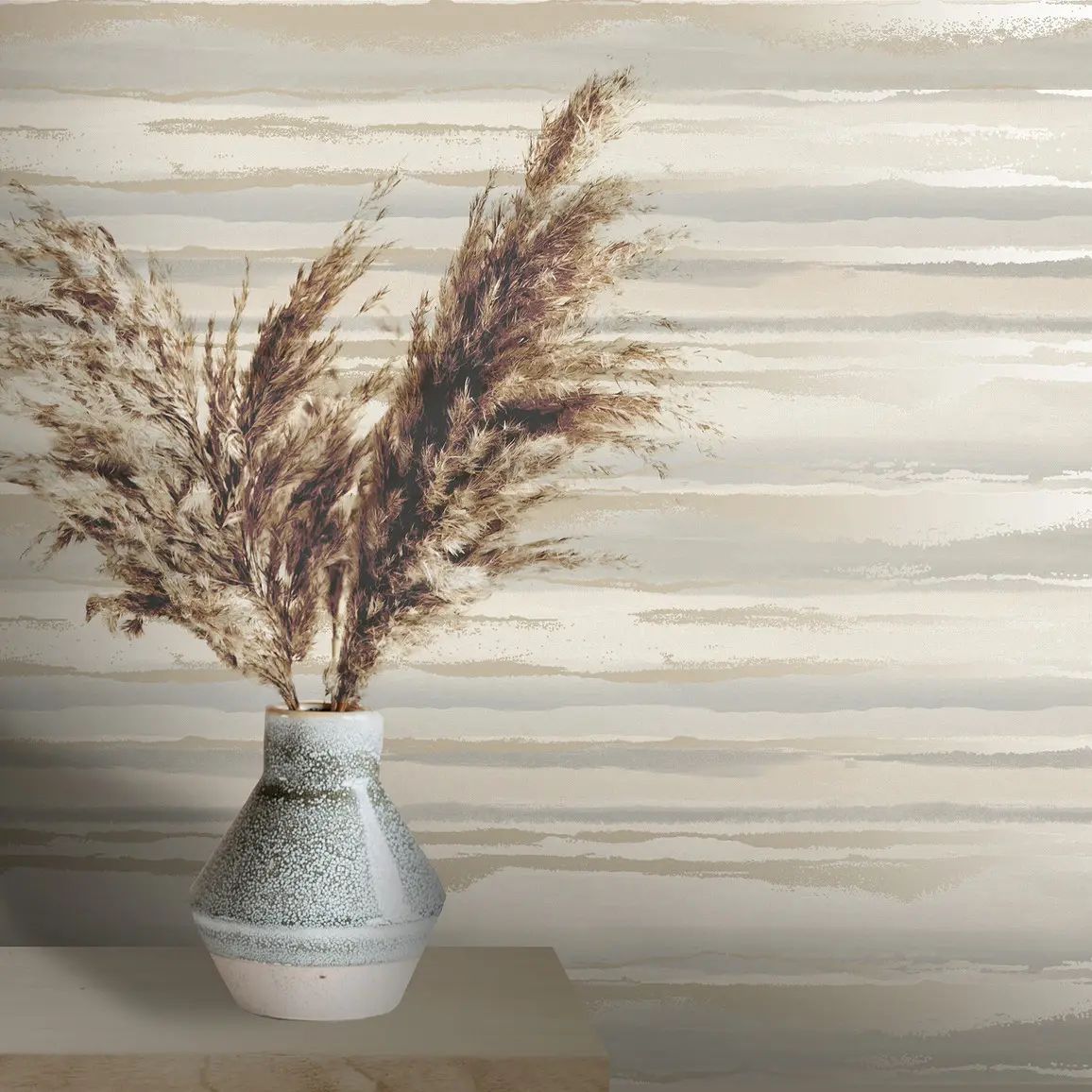 Calculate QuantityHorizon Mirage wallpaper from The Design Library's Elegant Homes collection adds a calm vibe to the space. The centrepiece of the design is a sweep of lines that resembles the setting sun and is completed in a contemporary mix of metallic and matt elements. Produced by Rasch UK for The Design Library; seen here in Blue & Pink.