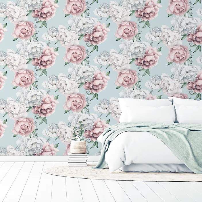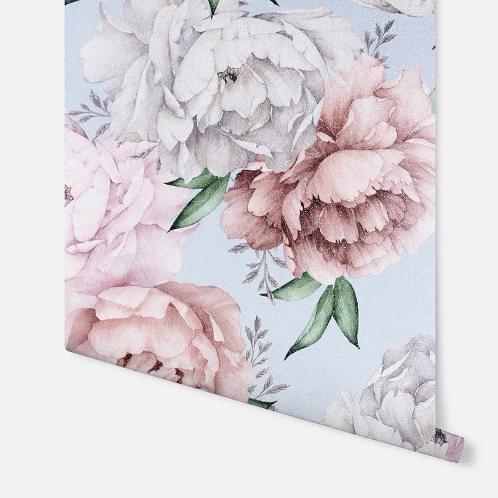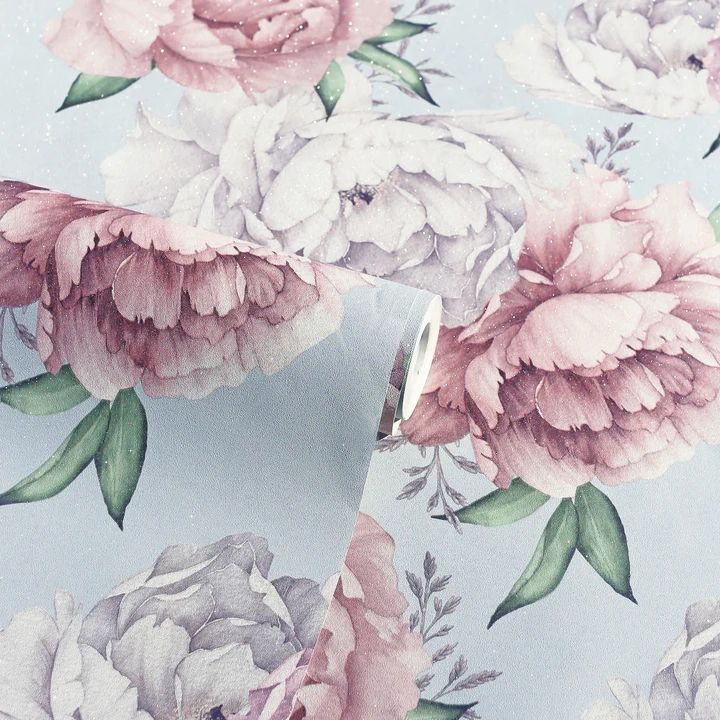 Calculate QuantityElevate the look of any room with this stunning peony floral wallpaper. The design showcases a captivating collection of large-scale peonies in delicate shades of white and pink, accented with subtle glitter highlights against a soothing mint backdrop. This wallpaper is perfect for creating a stylish feature wall or decorating an entire room.