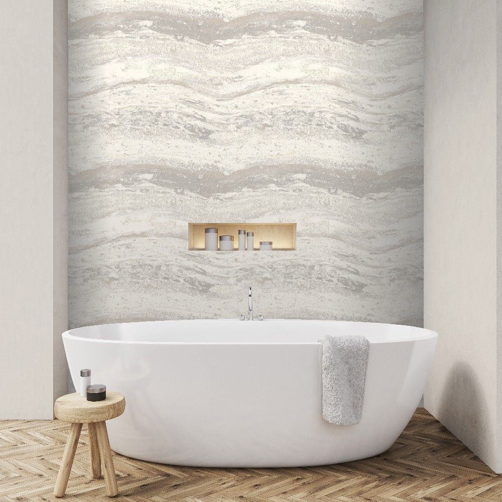 Stunning marbled stone effect wallpaper from Rasch. Showcasing an in-depth texture of marble stone with subtle metallic highlights, defiantly a show stopper! Other colours available too, and like always please purchase a sample for true colour and texture.