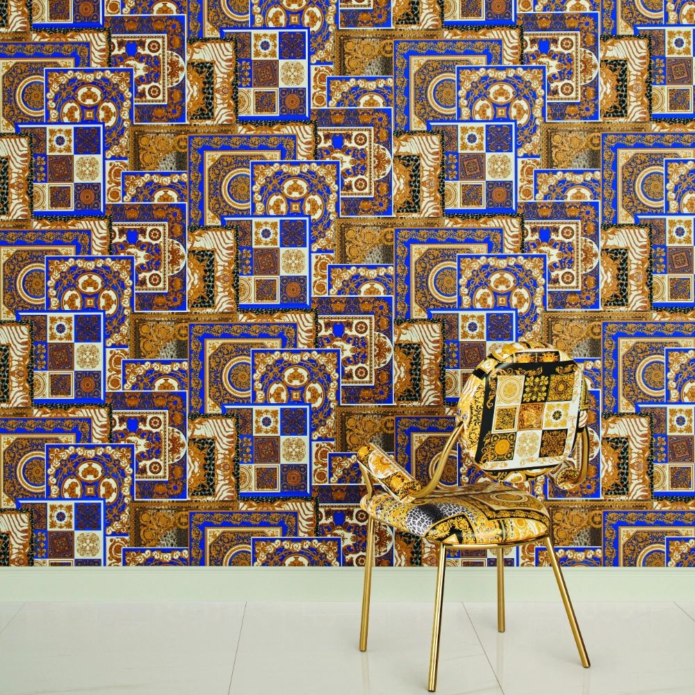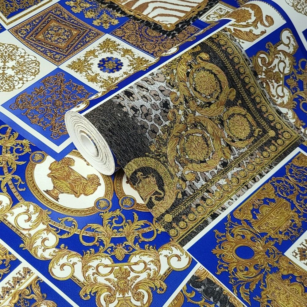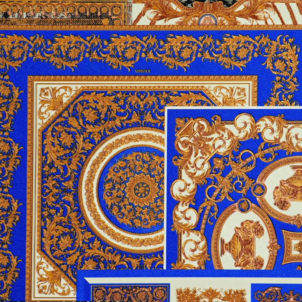 Calculate QuantityPart of the Découpage wallpaper collection, this design features a mix of heritage prints: Le Coupe des Dieux from the Fall-Winter 1991 runway collection and the Barocco print from the Spring-Summer 1992 runway collection, combined with signature Animalier motifs. The print is presented in a blue and gold-tone colour palette.