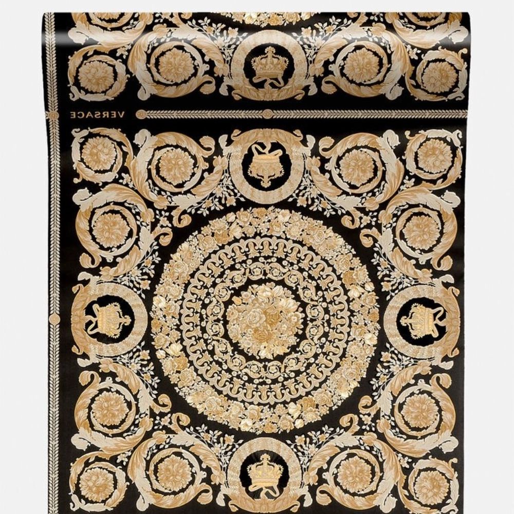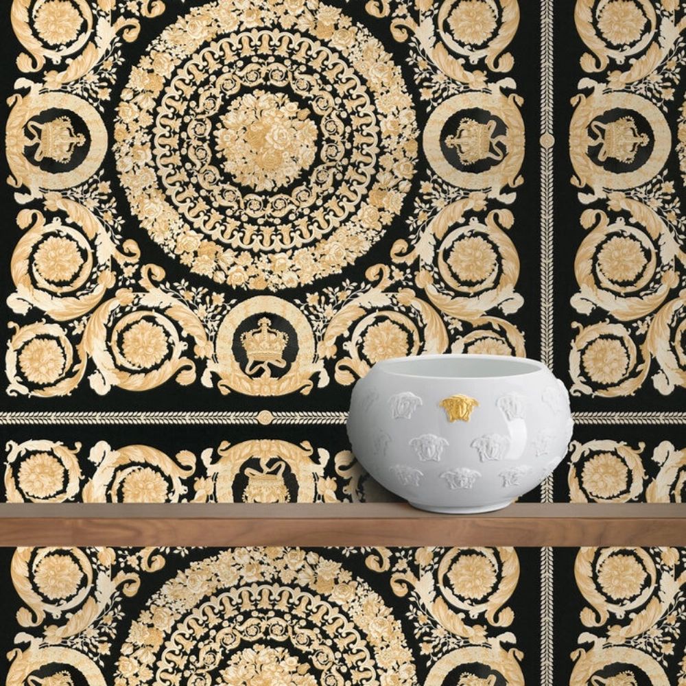This wallpaper from the Heritage collection boasts a classic Barocco print from the Fall-Winter 1991 collection in black and gold tones. The iconic print features subtle baroque floral elements.